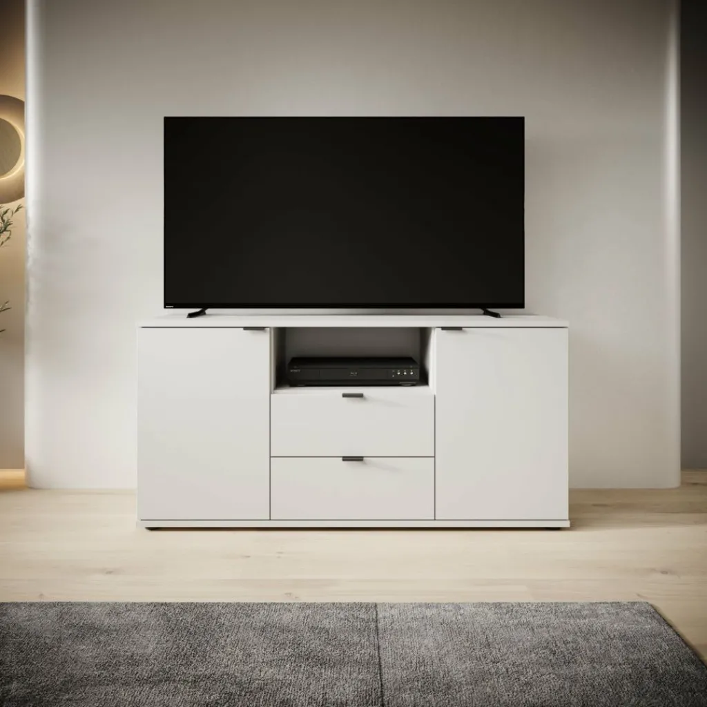 Galeno is een overzichtelijk tv-meubel met een strak ontwerp en een praktische indeling. Dit witte model heeft een breedte van 130 cm en biedt ruimte voor zowel je televisie als diverse accessoires en apparatuur.