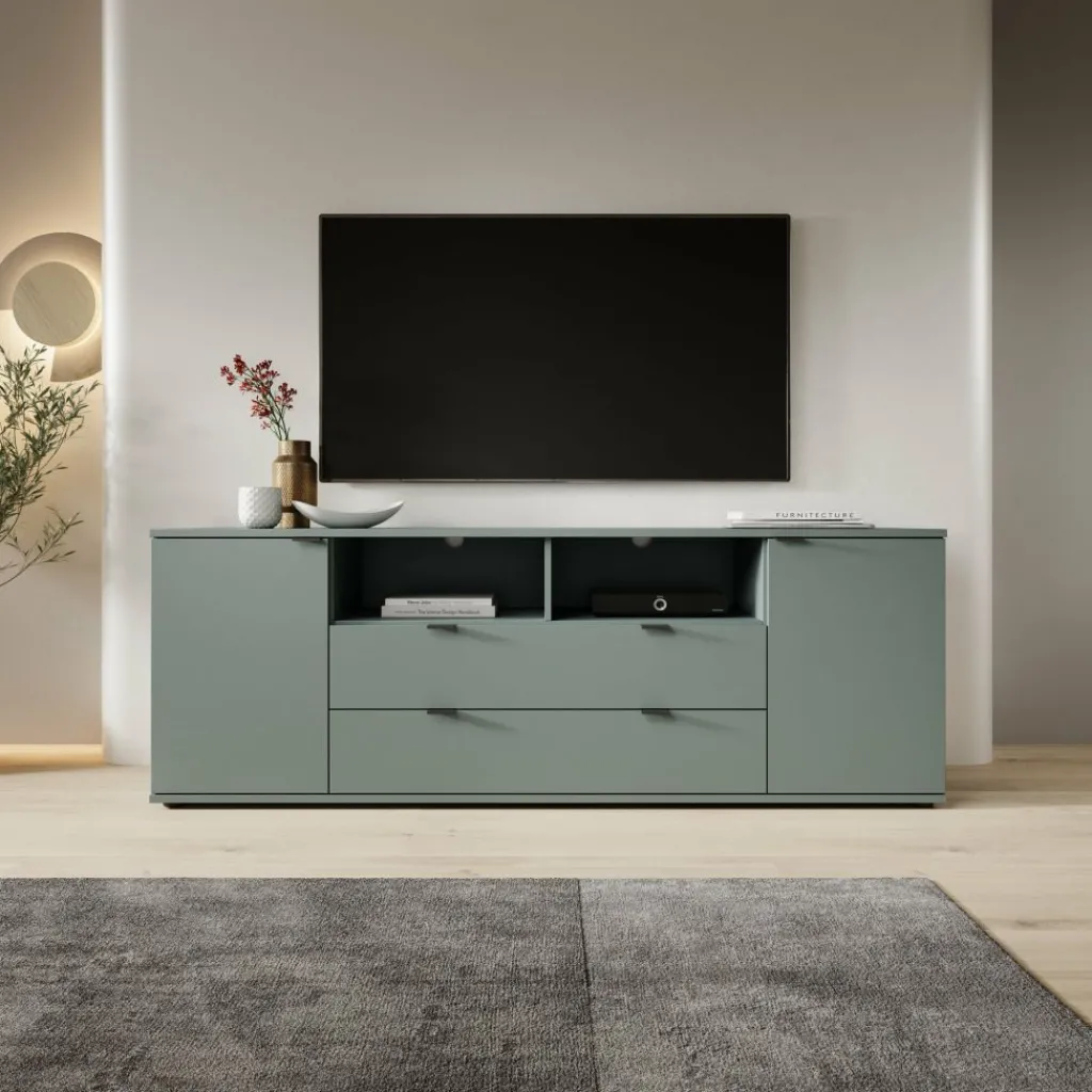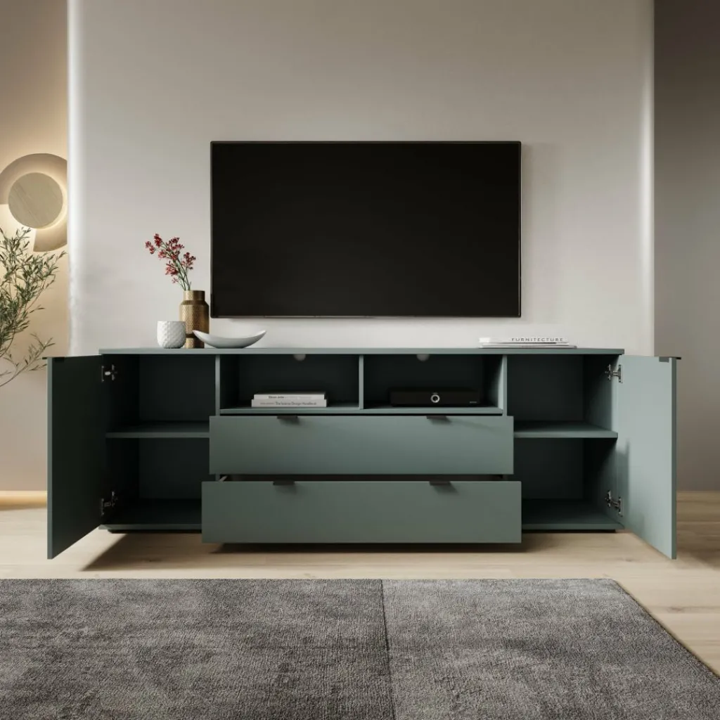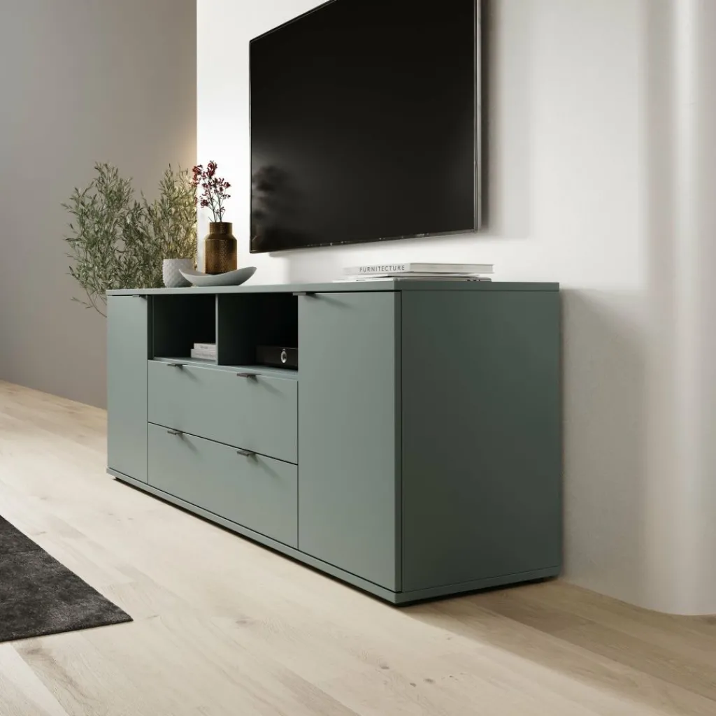 Het meubel is uitgevoerd in een matte groene kleur en heeft een gesloten, strak vormgegeven front zonder overbodige details. Aan de voorzijde bevinden zich twee deuren aan de zijkanten en twee lades in het midden. Achter de deuren zijn vaste opbergvakken met legplanken aanwezig voor spullen die je uit het zicht wilt opbergen. Elke legplank achter de deuren heeft een maximaal draagvermogen van 15 kg.