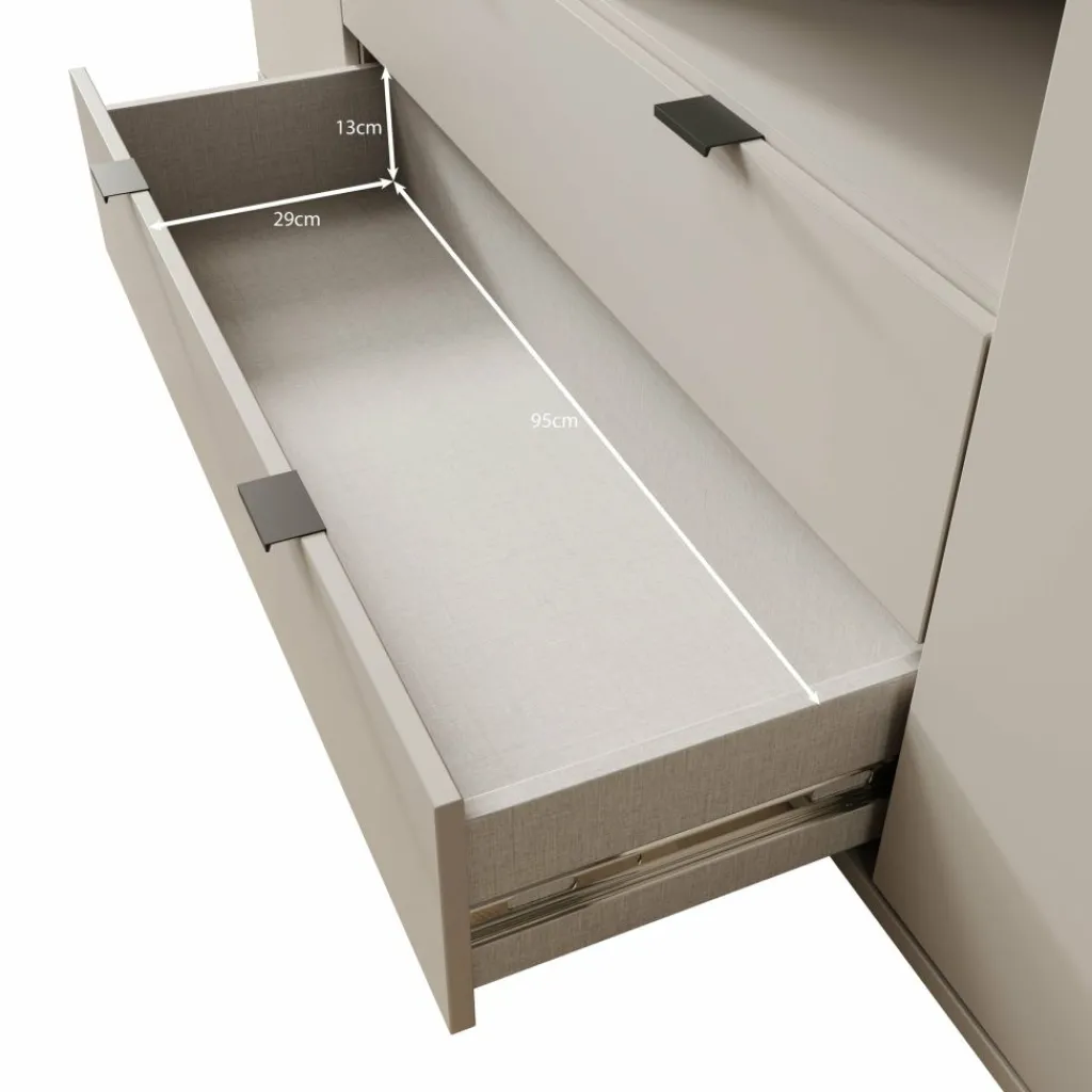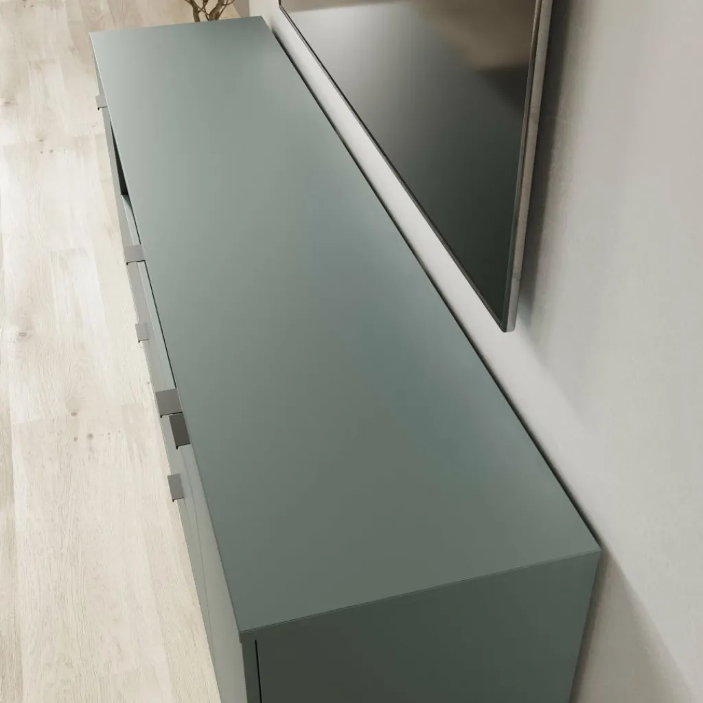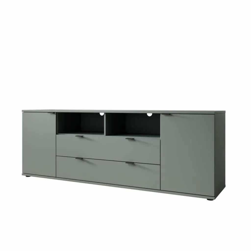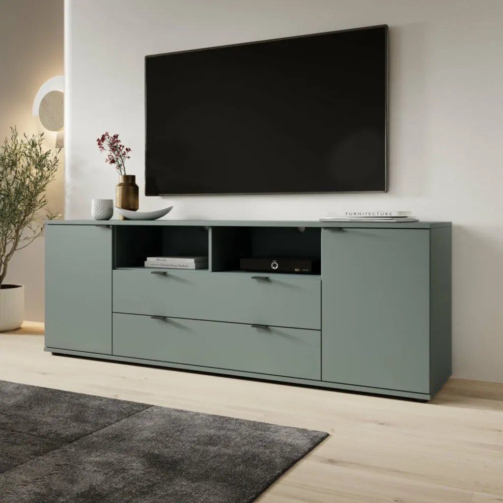 Het meubel is uitgevoerd in een matte groene kleur en heeft een gesloten, strak vormgegeven front zonder overbodige details. Aan de voorzijde bevinden zich twee deuren aan de zijkanten en twee lades in het midden. Achter de deuren zijn vaste opbergvakken met legplanken aanwezig voor spullen die je uit het zicht wilt opbergen. Elke legplank achter de deuren heeft een maximaal draagvermogen van 15 kg.