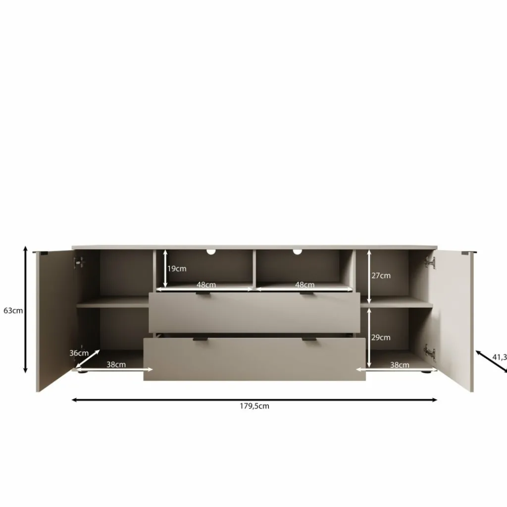 Het Galeno TV-meubel is een praktisch en strak vormgegeven meubel voor het overzichtelijk plaatsen van je televisie en randapparatuur. Met een breedte van 180 cm biedt dit model voldoende ruimte voor grotere tv’s en accessoires. De diepte van 41 cm en de hoogte van 63 cm zorgen voor een stabiele en overzichtelijke opstelling in de woonkamer.