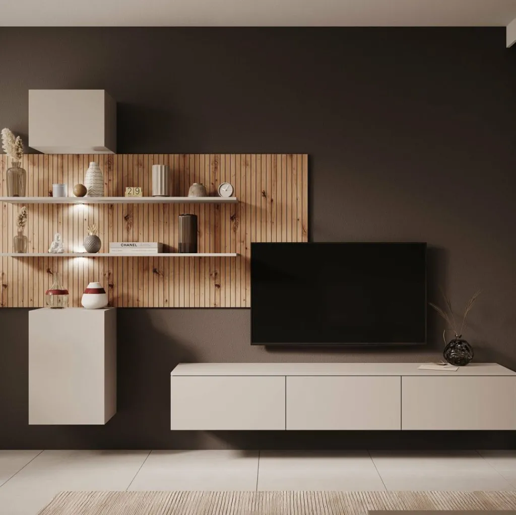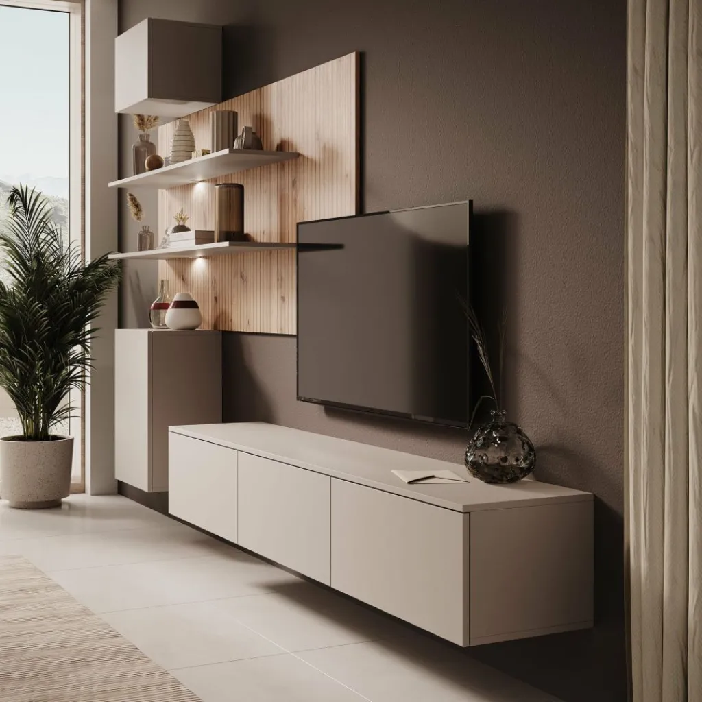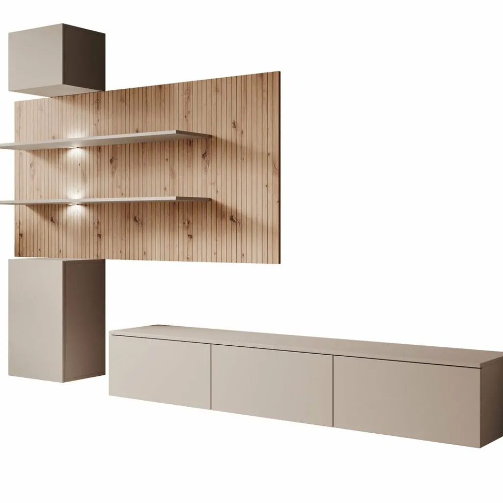 De tv kast beschikt over 3 kleppen en beide kastjes hebben 1 deur. Deze kleppen en deuren openen met het push to open systeem. De bijgeleverde witte LED-verlichting maakt het meubel helemaal compleet.