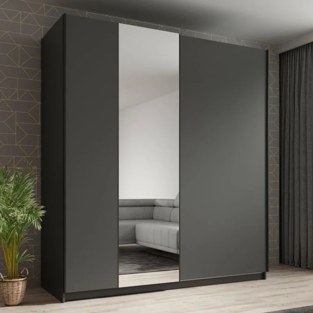 De kast is uitgerust met schuifdeuren, waarvan één voorzien is van een grote spiegel – handig voor het aankleden én optisch vergrotend voor de ruimte. Achter de deuren vind je een ruime indeling met een hanggedeelte (met roede), vier legplanken en een bovenplank over de volledige breedte. Dankzij deze opstelling is er volop ruimte voor zowel hang- als vouwkleding.