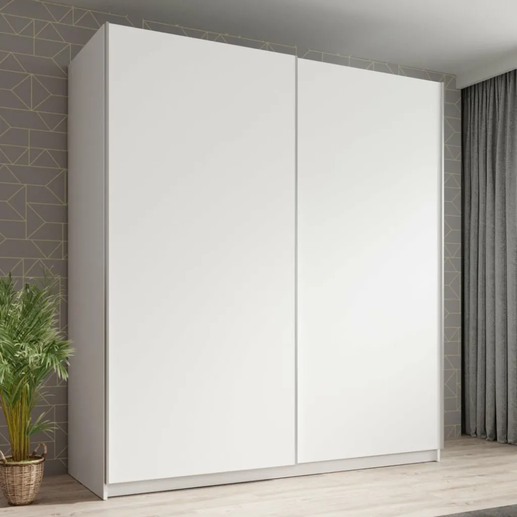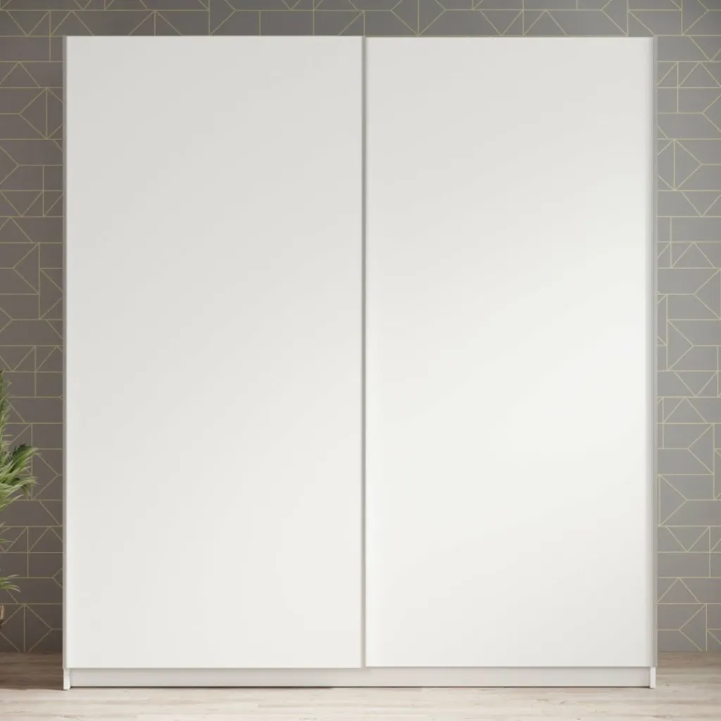 De Ganaro kledingkast van 180 cm breed biedt veel praktische opbergruimte in een strak en tijdloos design. De kast is afgewerkt in wit en voorzien van twee schuifdeuren met geïntegreerde handgrepen, wat zorgt voor een rustige en moderne uitstraling in de slaapkamer.