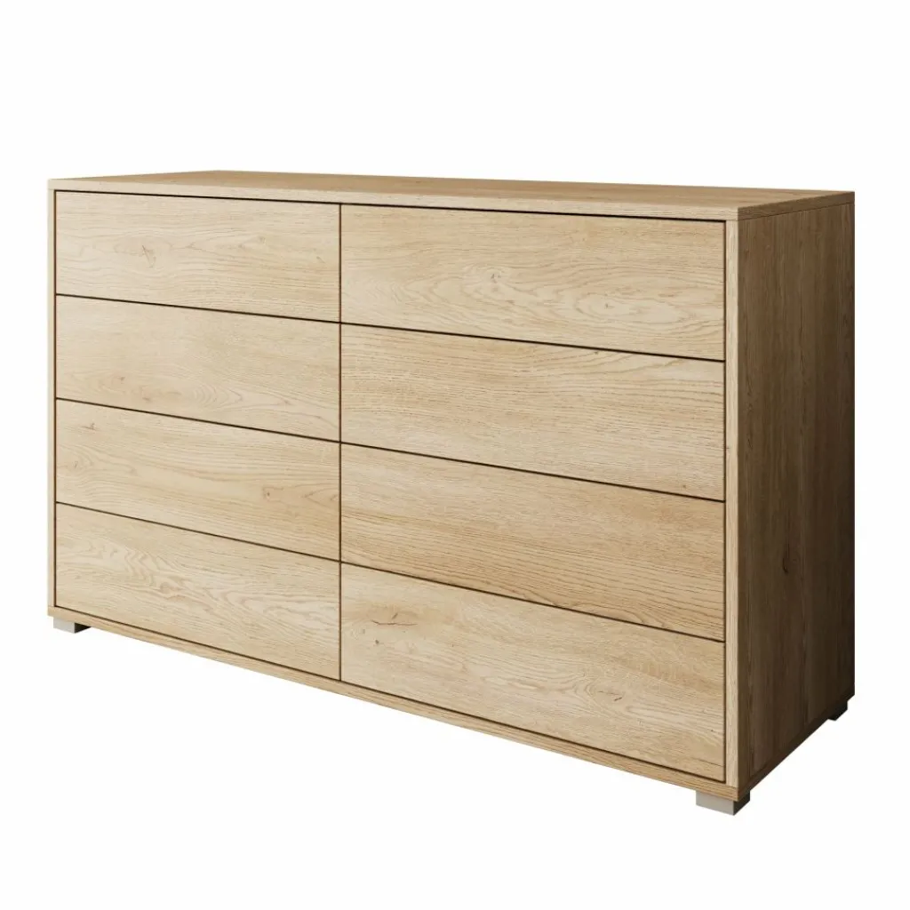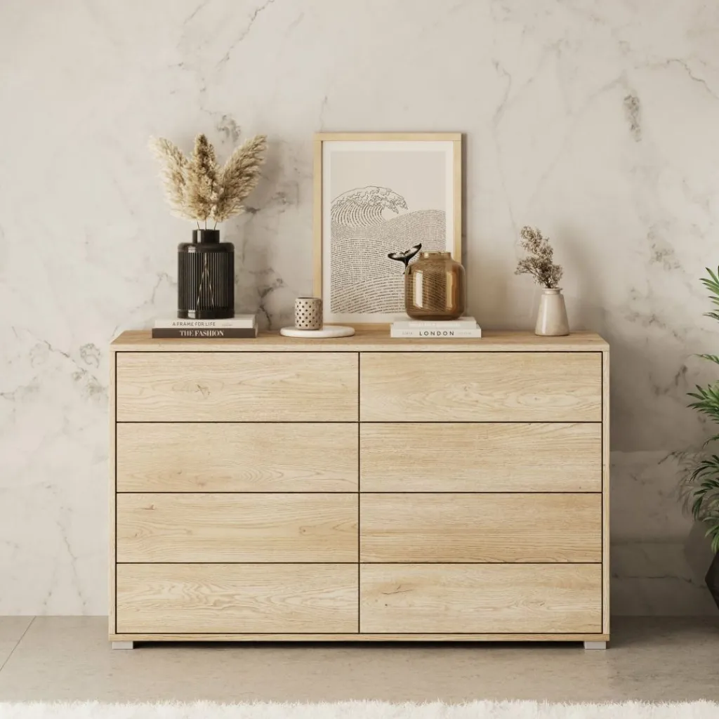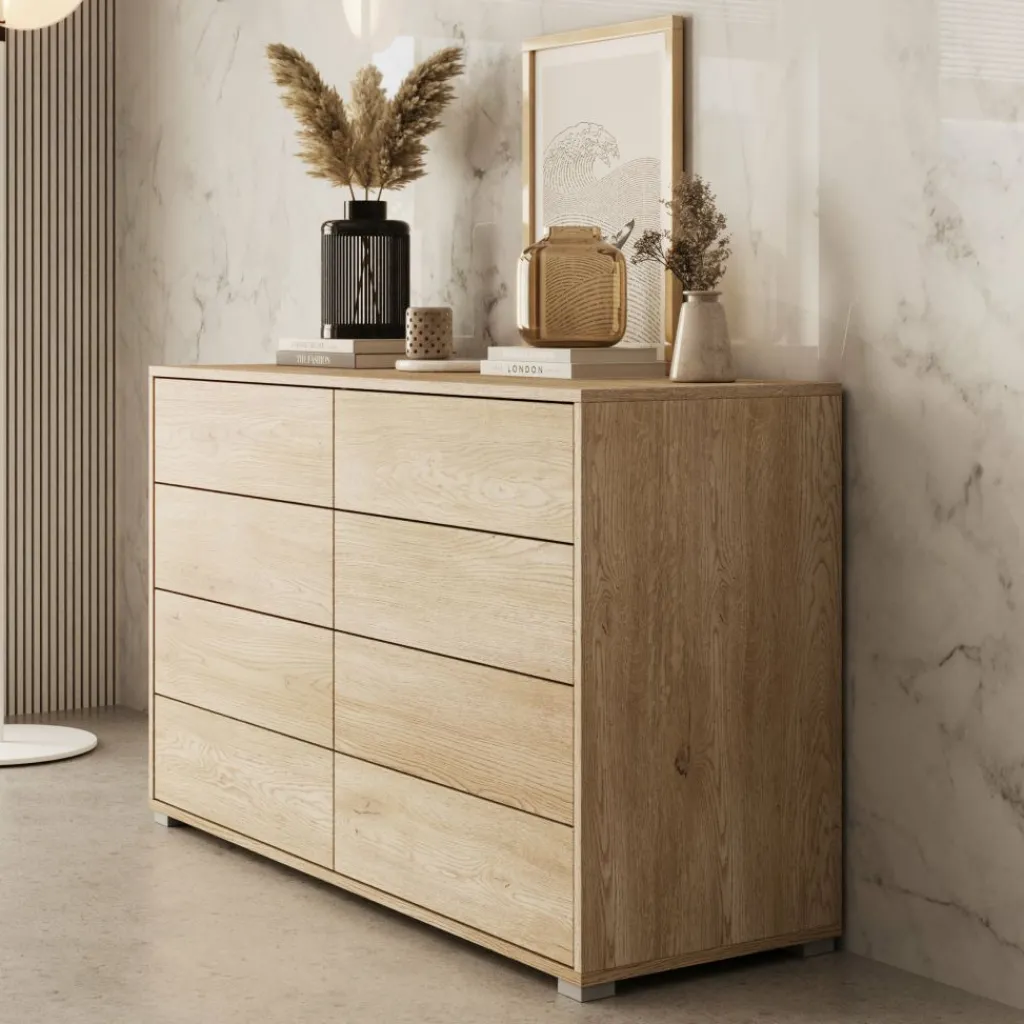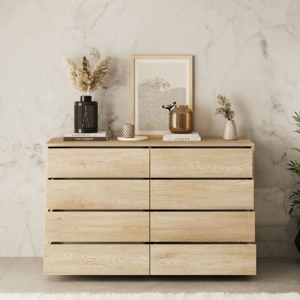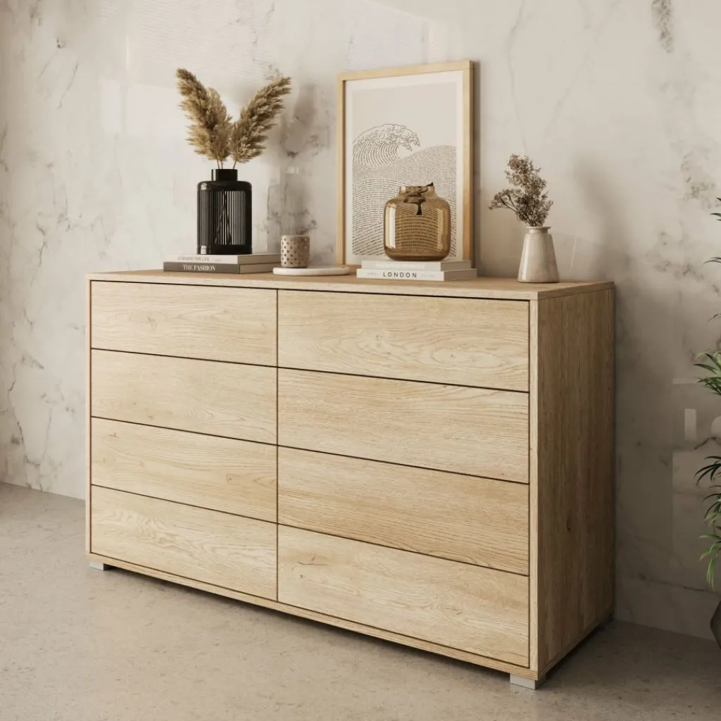 De kast is uitgevoerd in een eikenpatroon met een duidelijke houtstructuur, wat zorgt voor een neutrale en tijdloze uitstraling. Aan de voorzijde is de ladekast voorzien van acht lades, verdeeld over twee kolommen. Hierdoor kun je kleding, accessoires of andere spullen gescheiden en overzichtelijk opbergen. De lades zijn greeploos uitgevoerd, wat het front strak en rustig houdt.