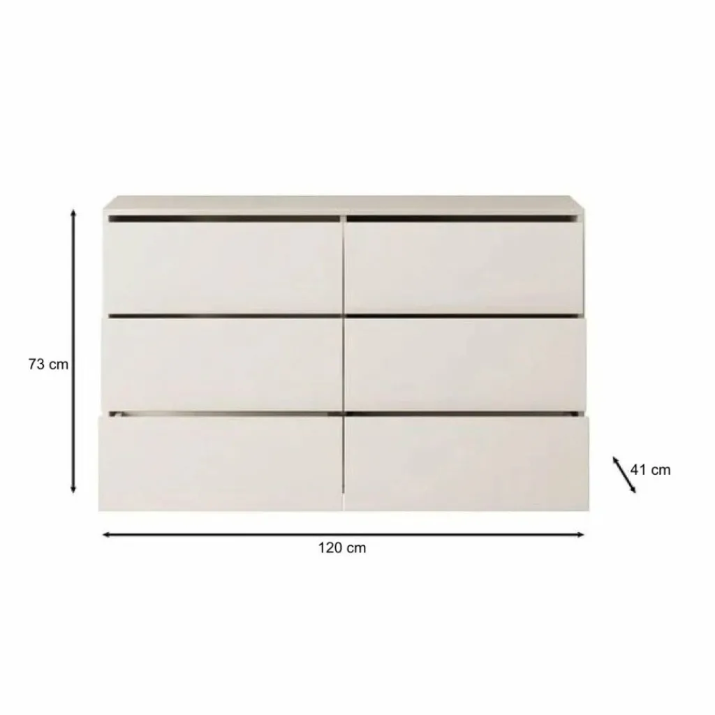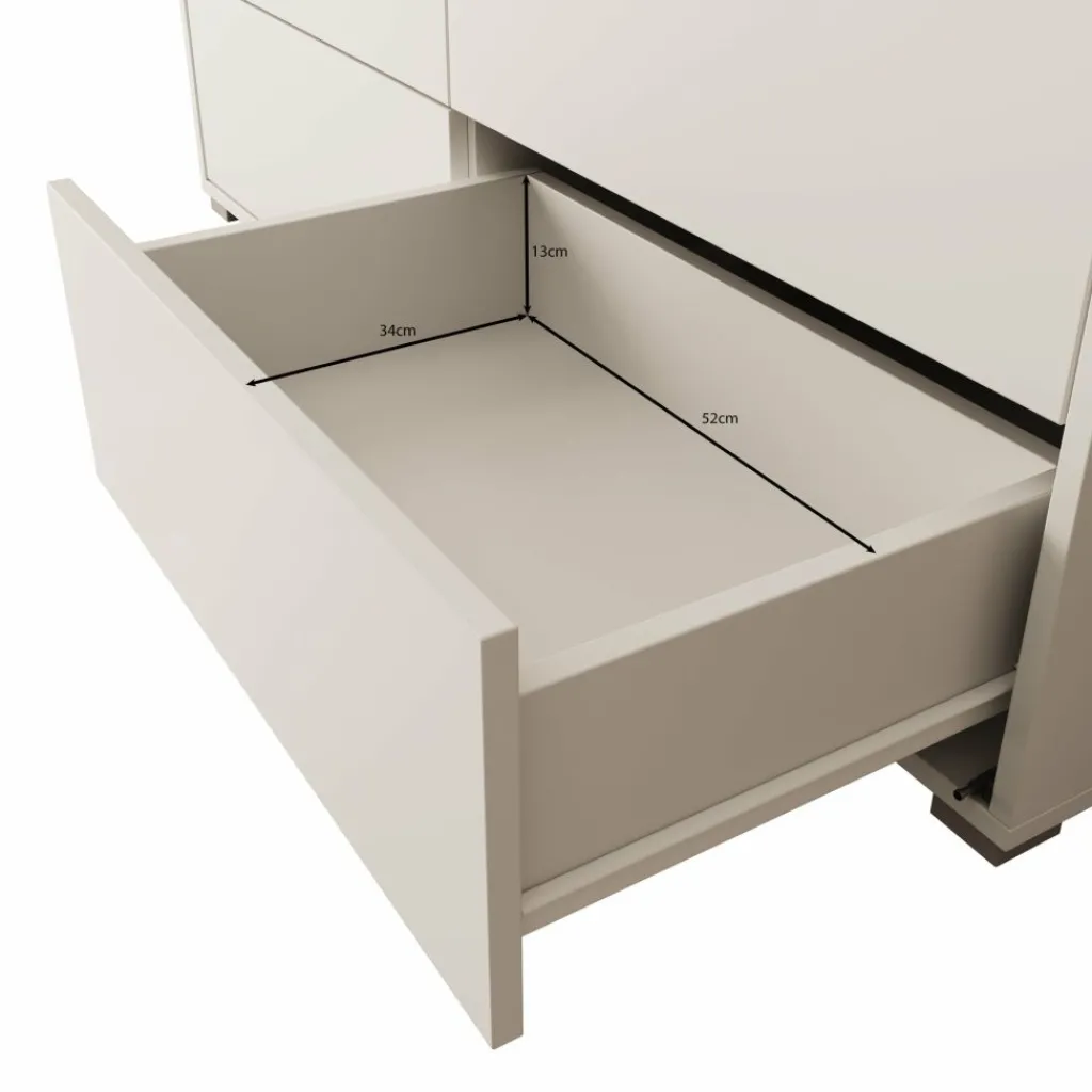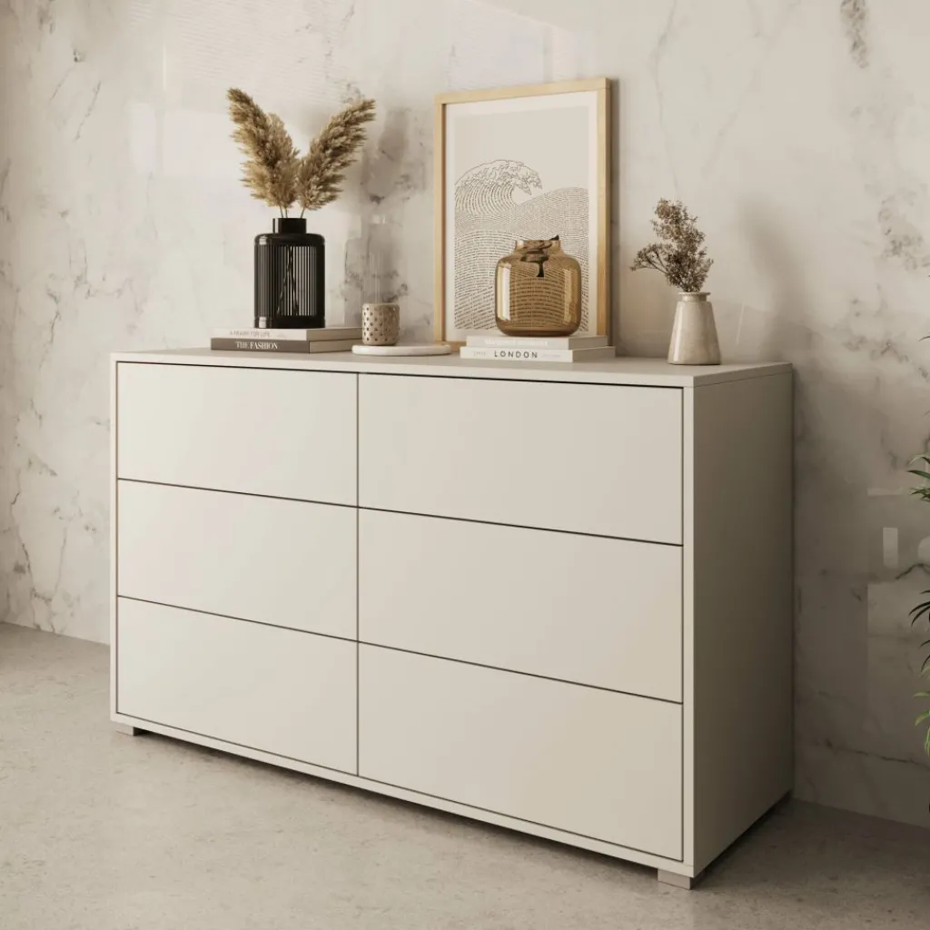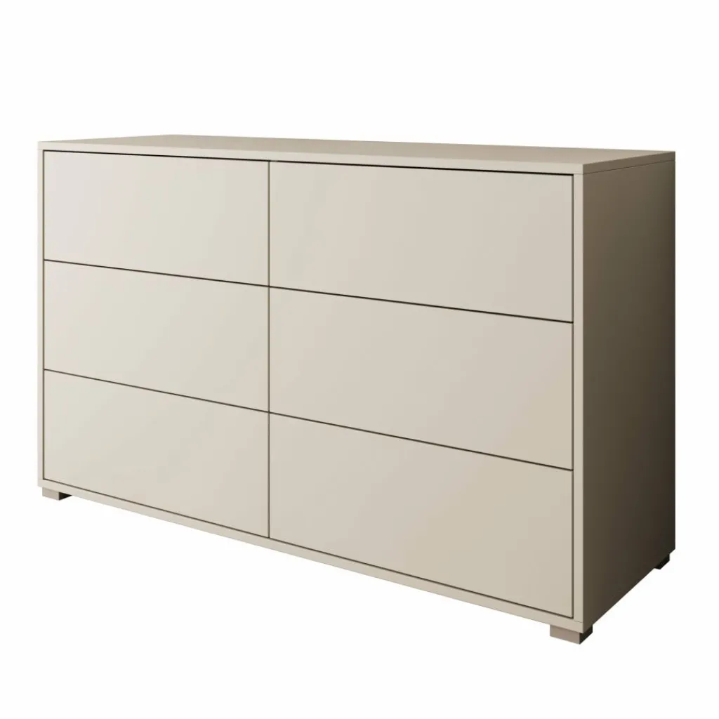 Ladekast Gideon is een moderne en strak vormgegeven opbergkast, uitgevoerd in beige met zes ruime lades. Dankzij het push-to-open systeem ogen de lades greeploos en strak, terwijl je ze moeiteloos opent met een lichte druk. De zilverkleurige poten geven het meubel een subtiel stijlaccent.