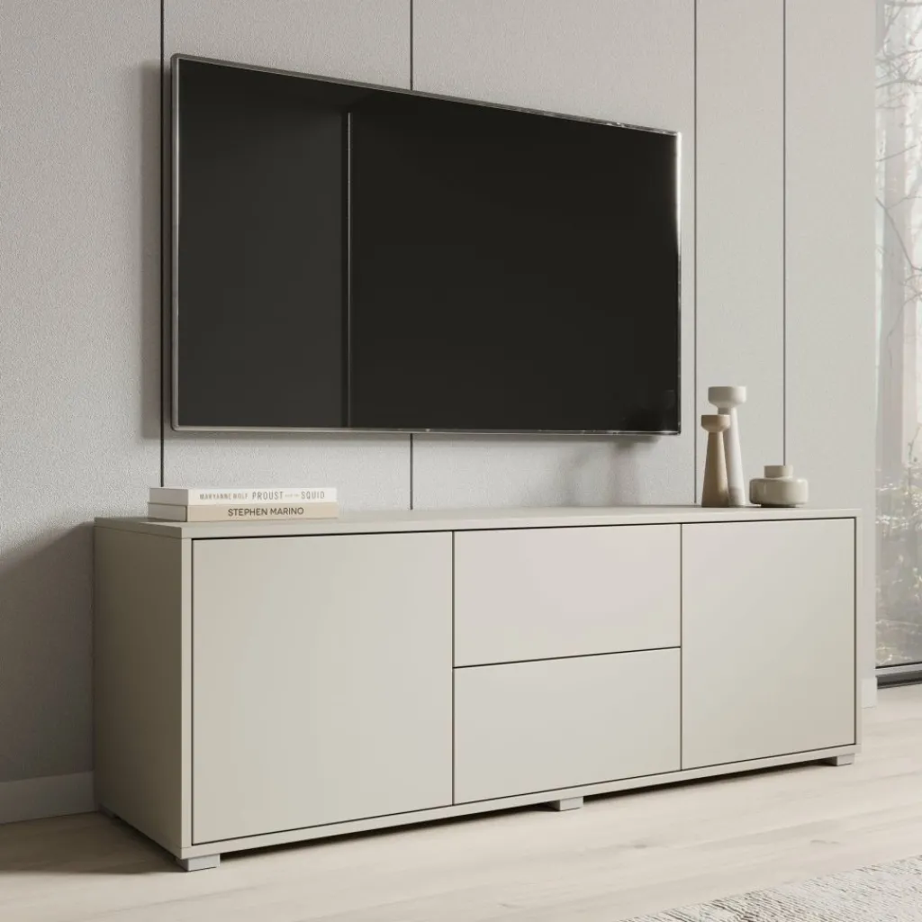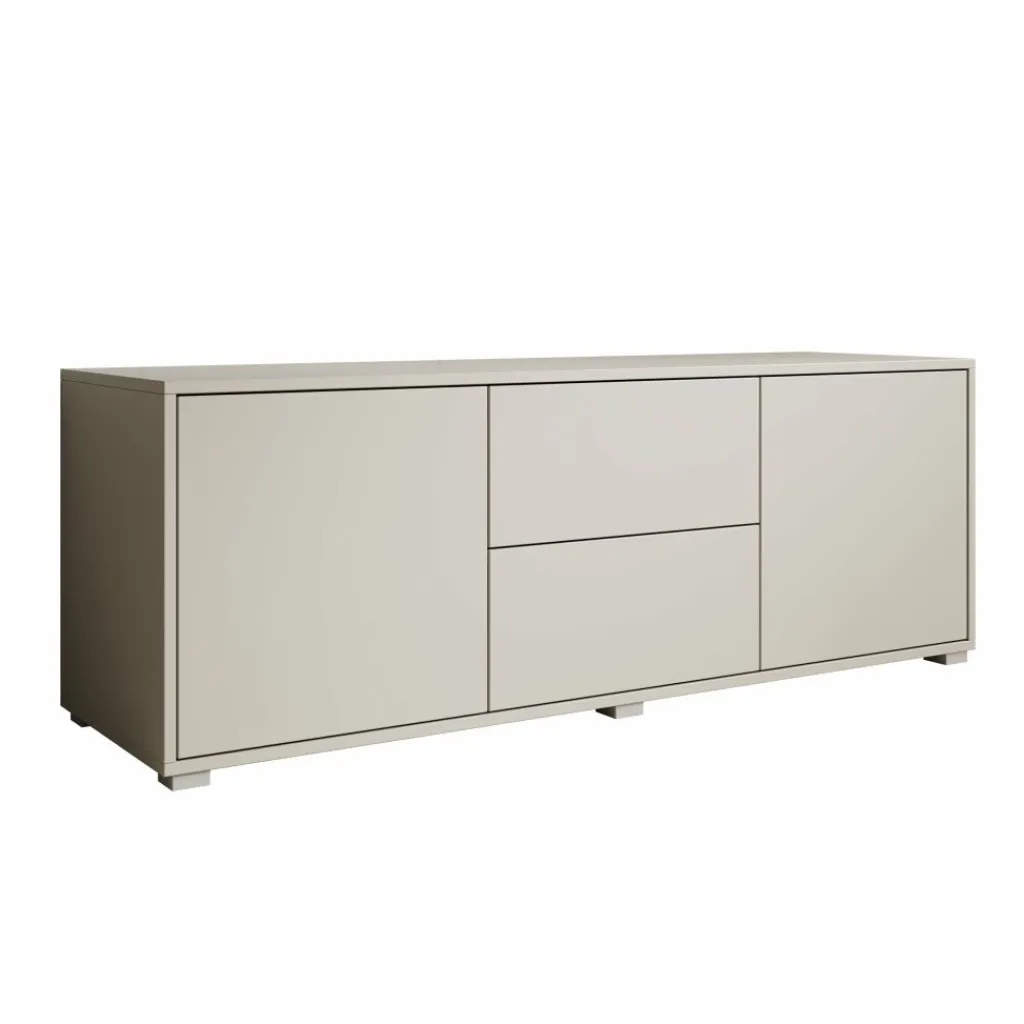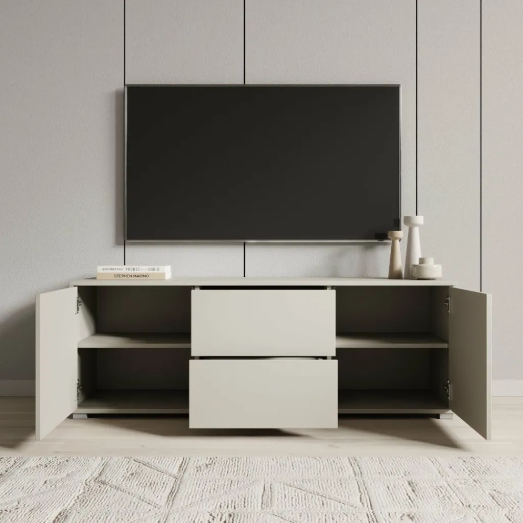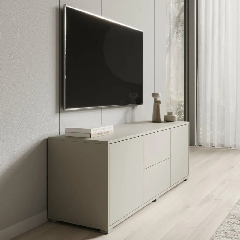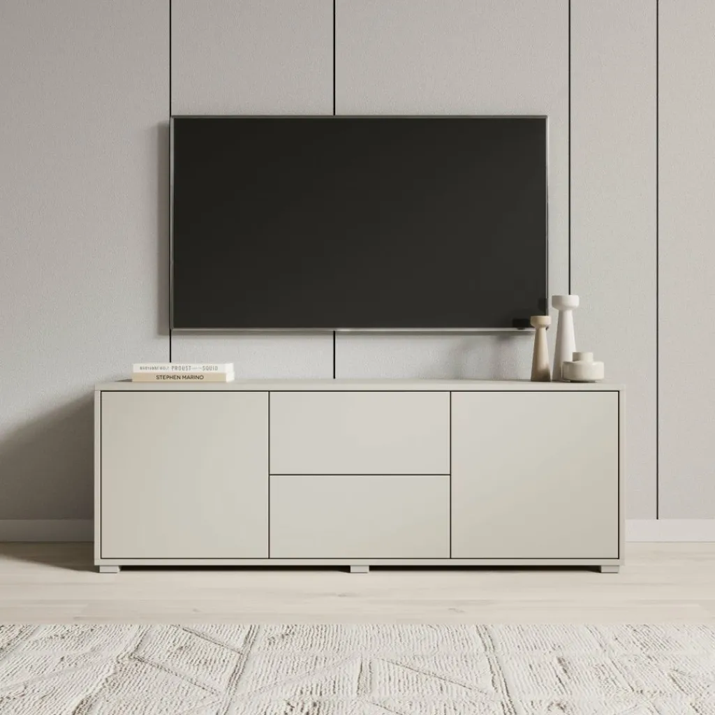 TV-meubel Gideon is een strak vormgegeven kast die perfect past in een modern interieur. Dankzij de neutrale beige kleur en de greeploze afwerking met push-to-open systeem oogt het meubel rustig en eigentijds.