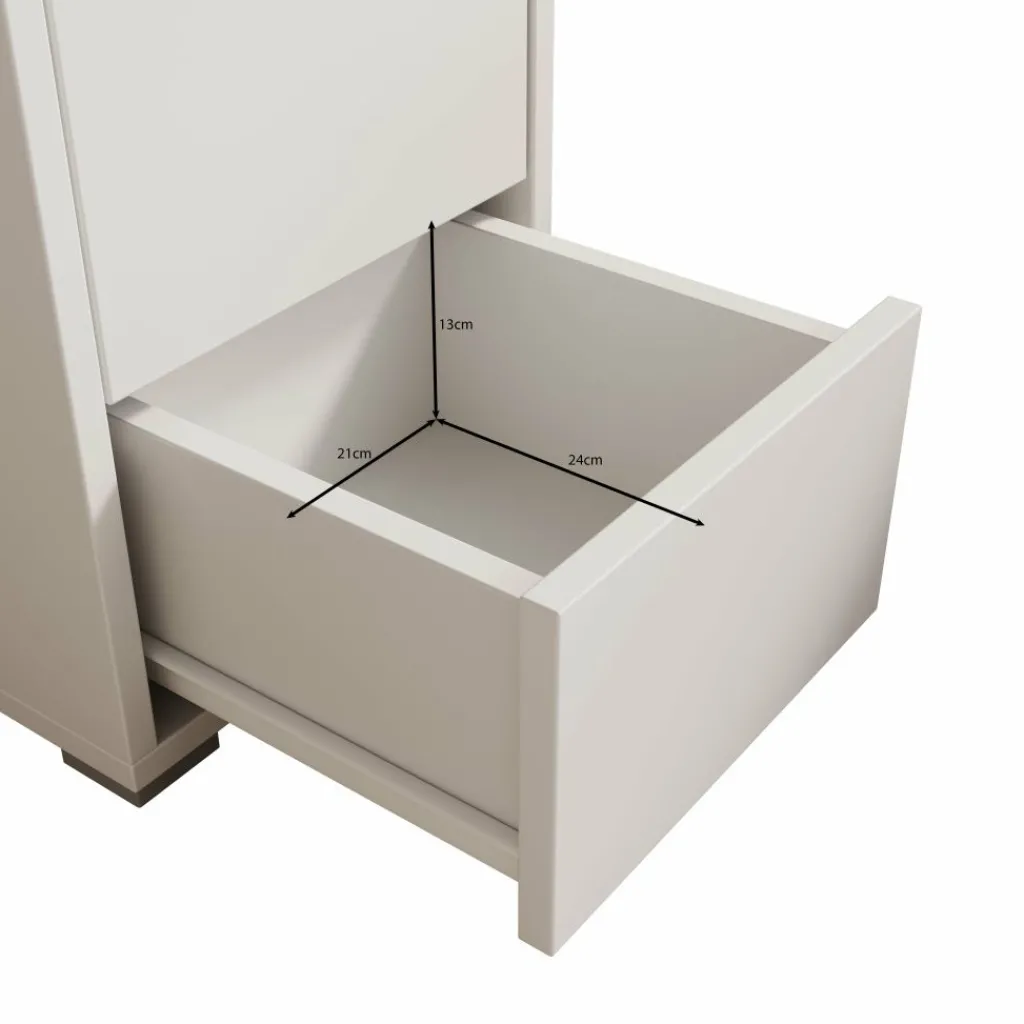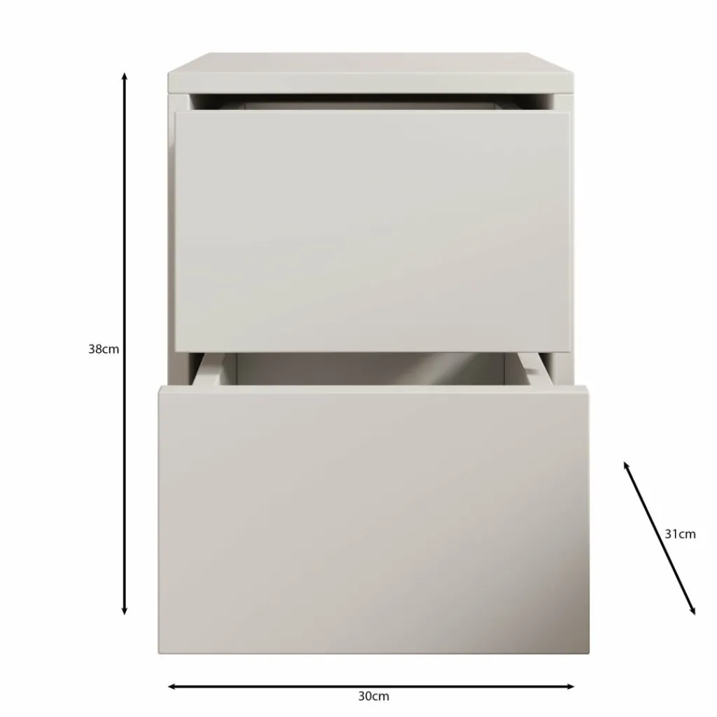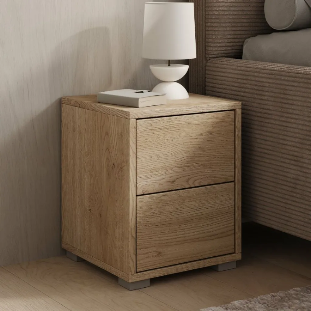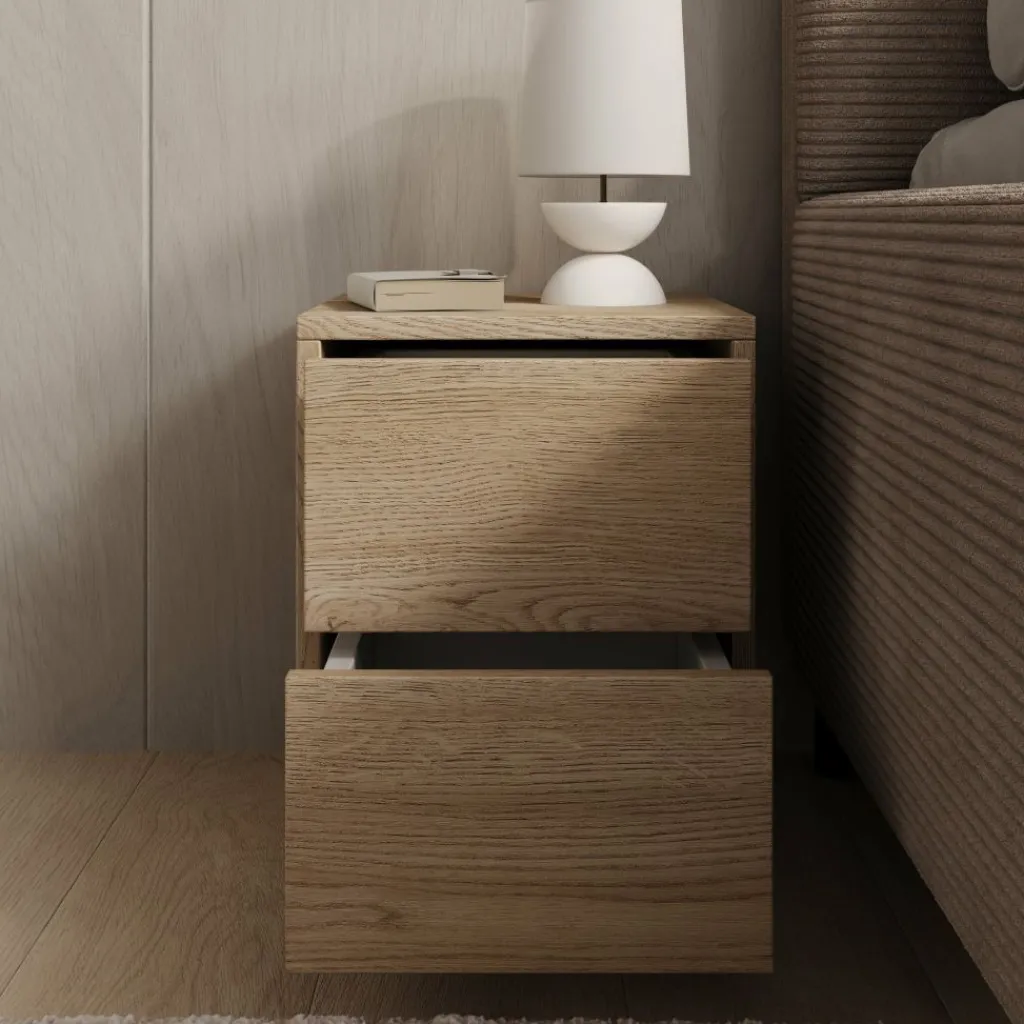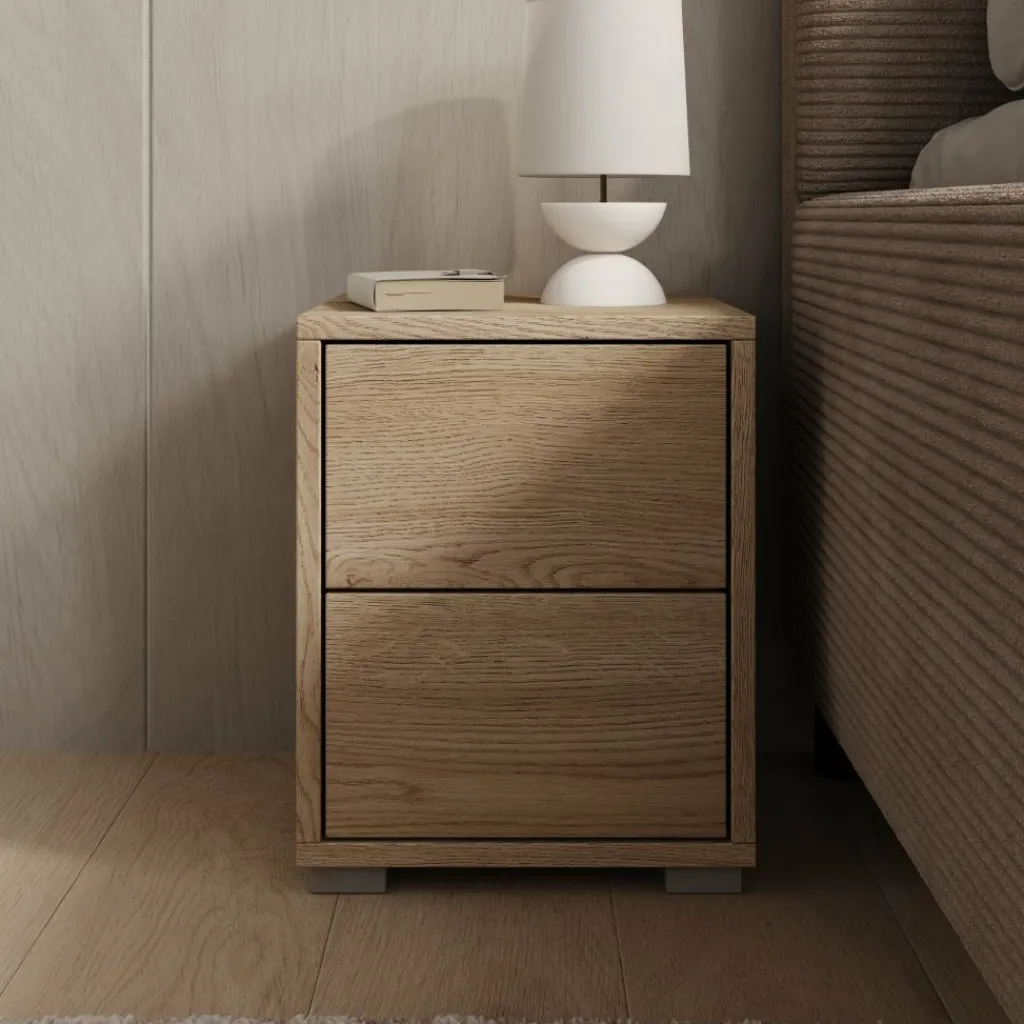 Het nachtkastje is voorzien van twee lades waarin je spullen zoals een boek, oplader of andere persoonlijke items netjes kunt opbergen. De lades zijn greeploos uitgevoerd, wat zorgt voor een strak en rustig front. Dankzij de stabiele constructie is het kastje geschikt voor dagelijks gebruik en vormt het een praktische aanvulling naast je bed.