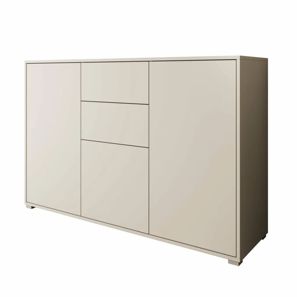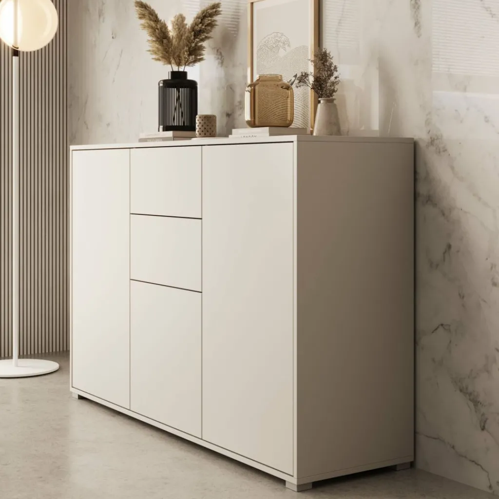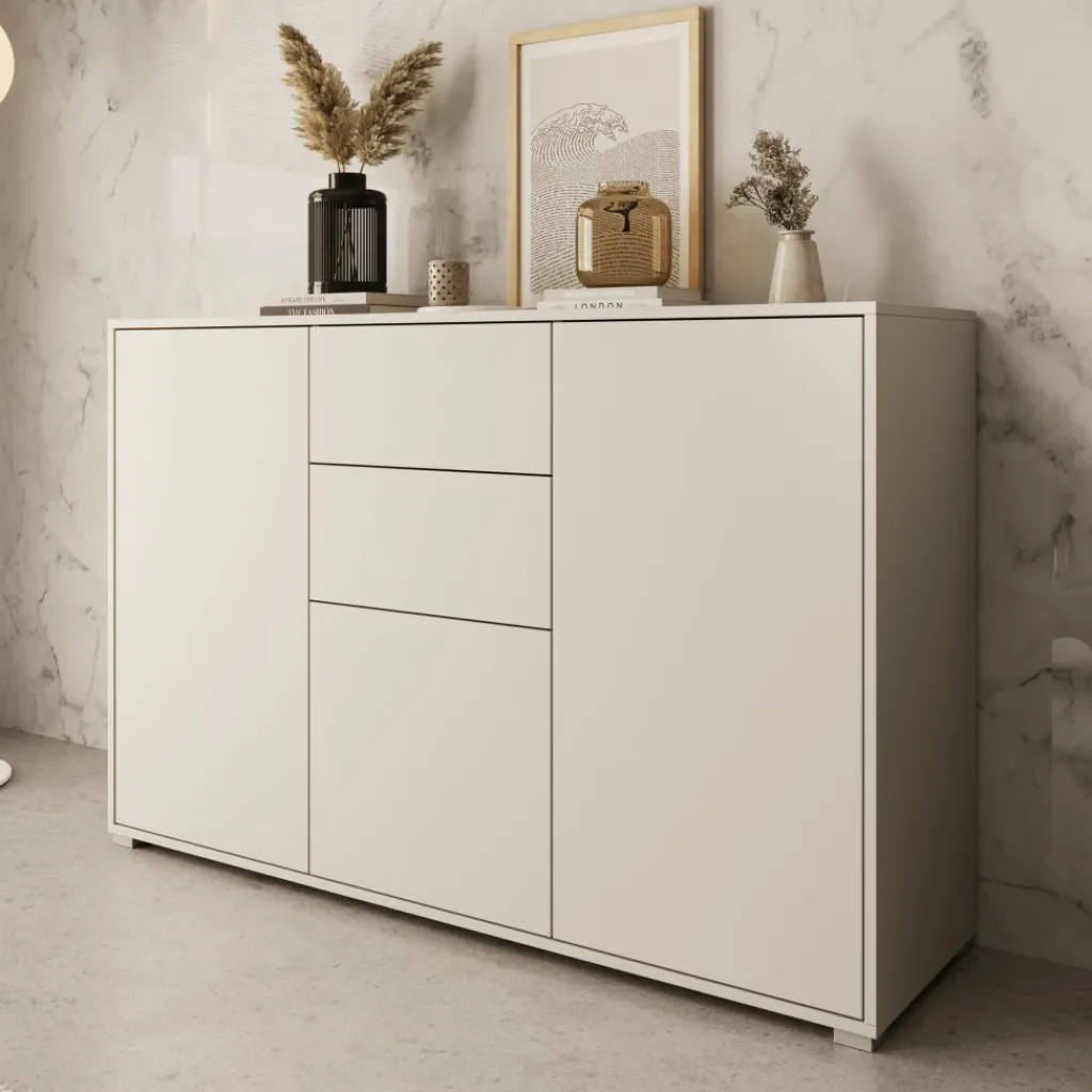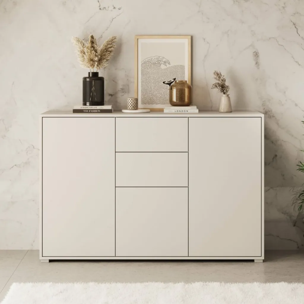 Dressoir Gideon is een opbergkast in een moderne stijl. De kast beschikt over 2 lades en 3 deuren die openen met het push to open systeem. Achter de deuren zijn nog in totaal 5 opbergvakken te vinden. Het meubel is uitgevoerd in de kleur beige en staat op zilverkleurige pootjes.
