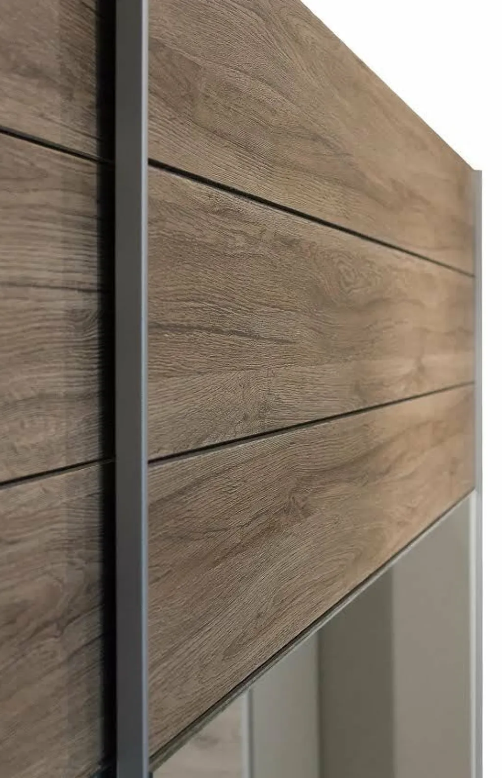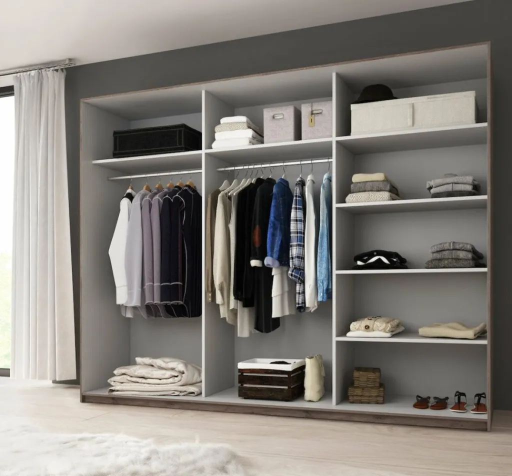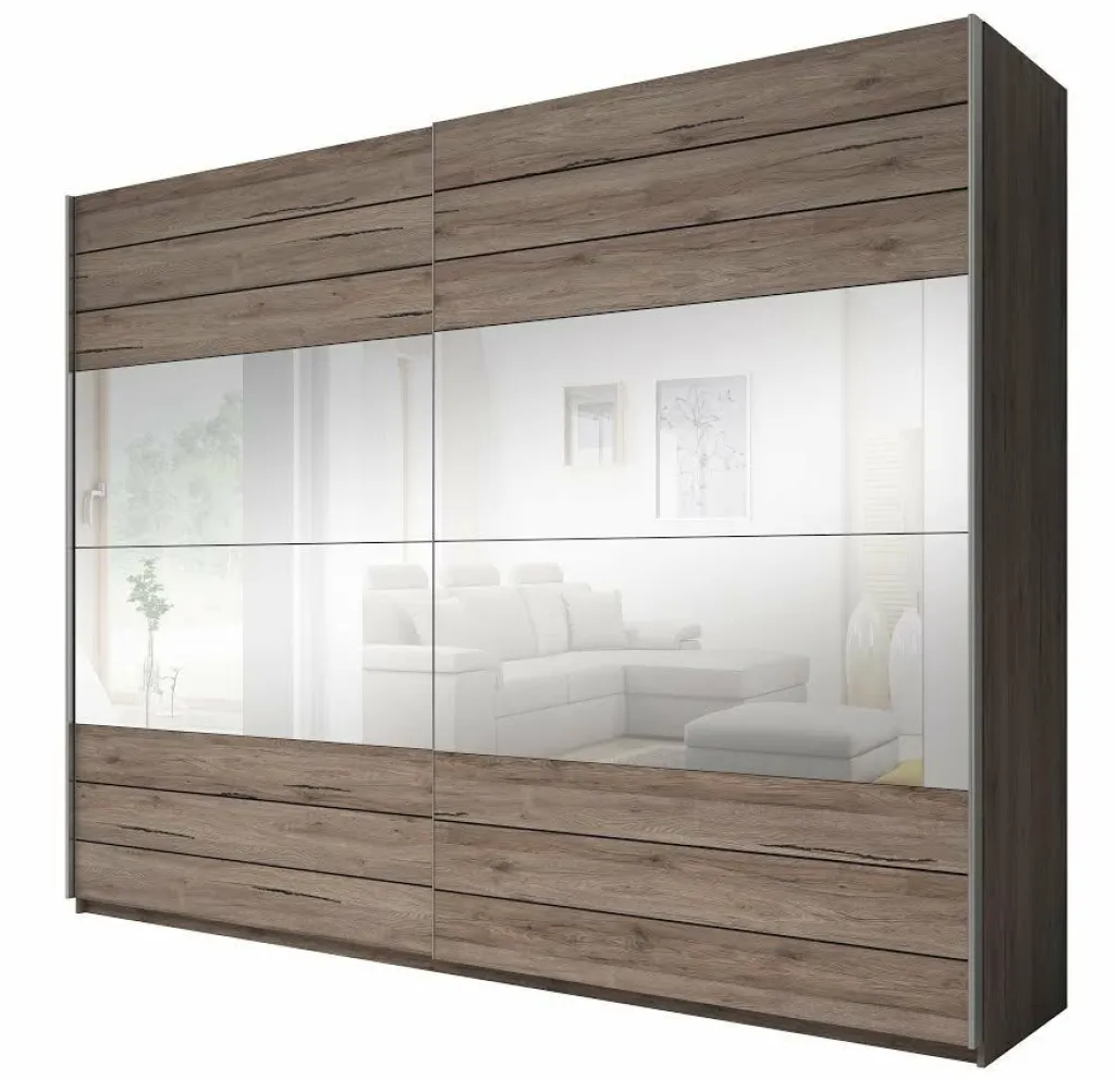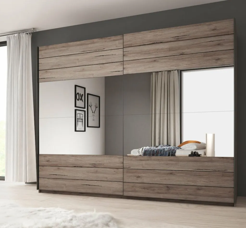 Garderobekast Gina is een grote, praktische kledingkast uitgevoerd in eiken. De kledingkast beschikt over 2 schuifdeuren waardoor ruimte wordt bespaard. Het binnenwerk bestaat uit 3 delen. 2 delen hebben een open schap en een grote opbergruimte met metalen stang om kleding aan om te hangen. Het derde deel beschikt over maar liefst 5 open schappen.