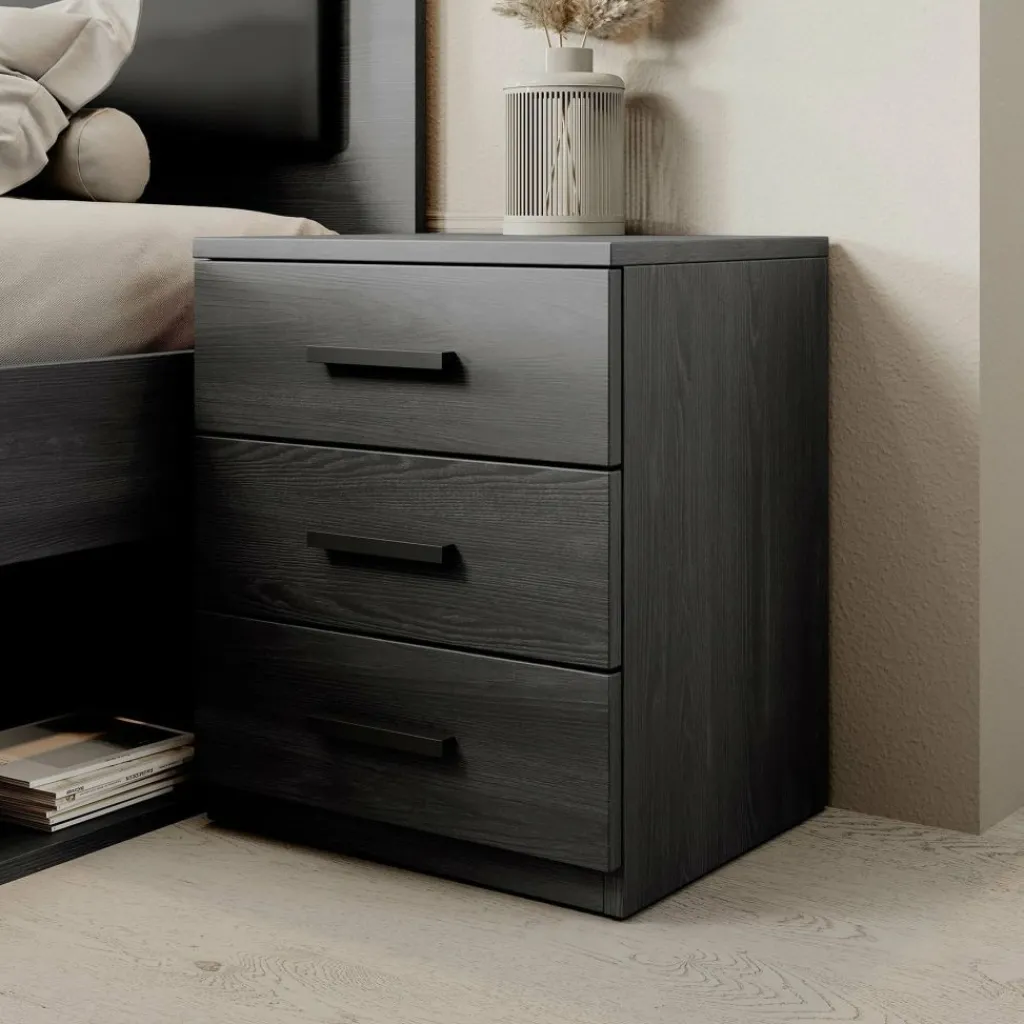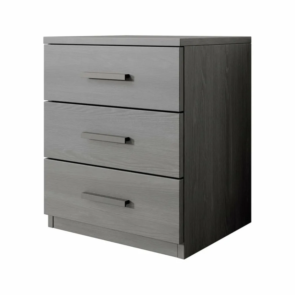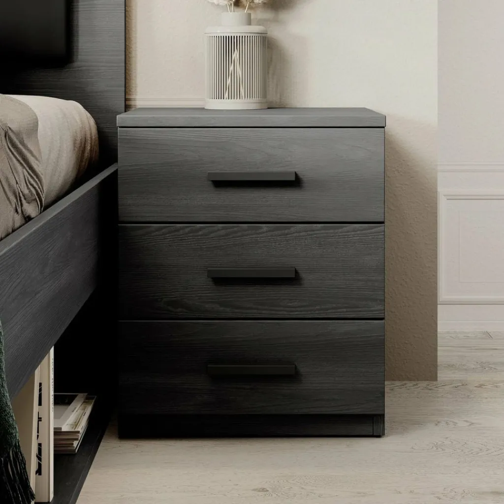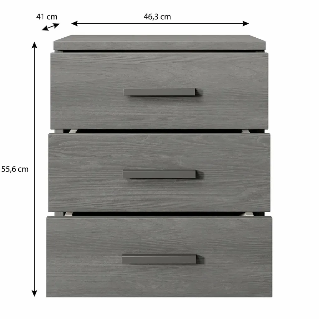 Nachtkastje Gina is een praktische opbergkast met een strak en modern design. Het meubel is uitgevoerd in een antraciet eiken kleur en beschikt over drie lades, waardoor je voldoende ruimte hebt voor het netjes opbergen van dagelijkse spullen naast het bed.