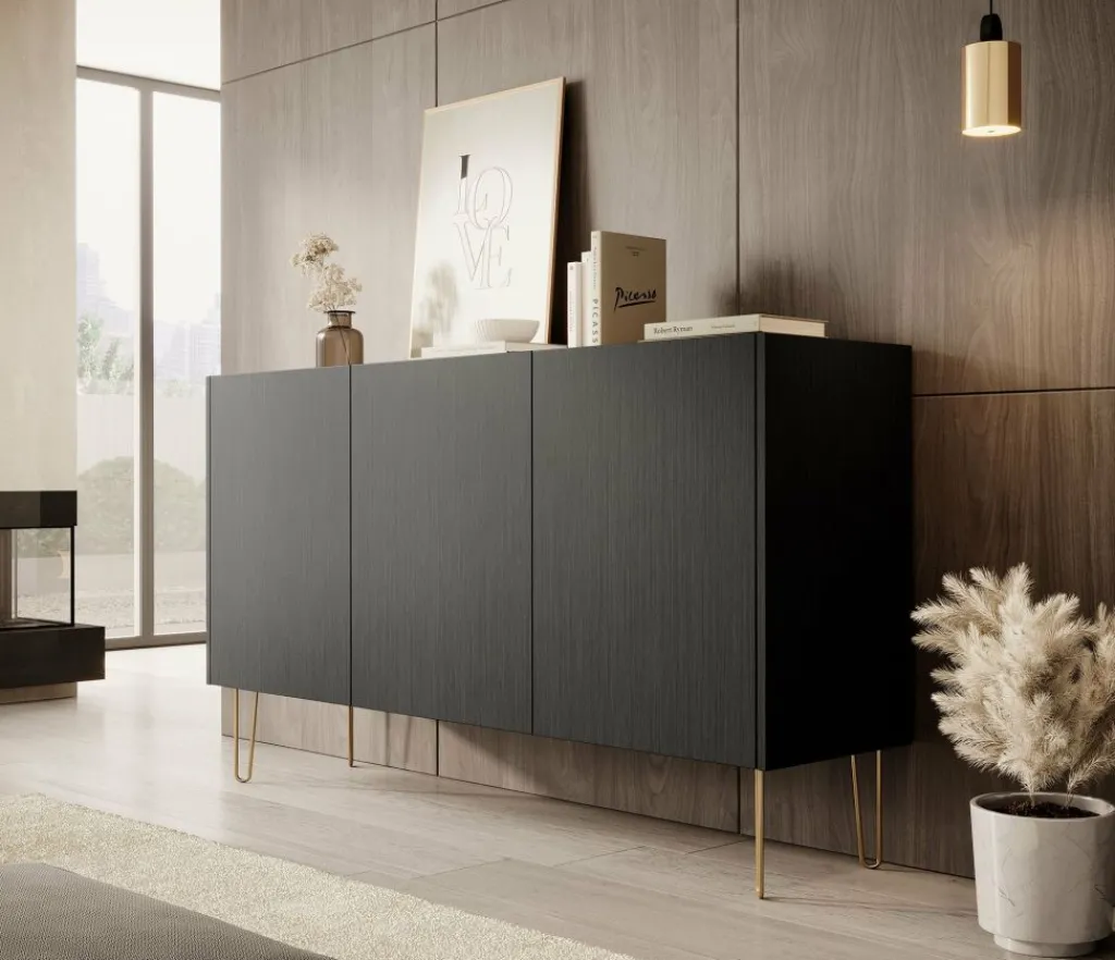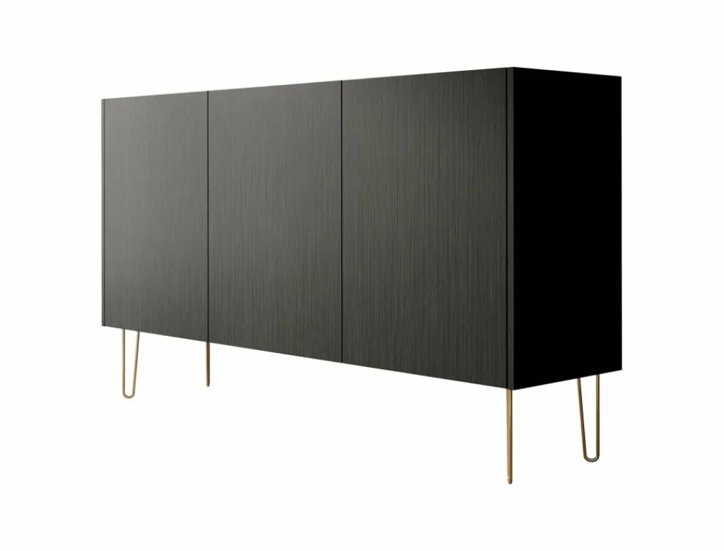 Dressoir Hacienda is een moderne designkast, uitgevoerd in een zwart eiken kleur. Het bovenblad is in marmerlook. De kast beschikt over 3 klapdeuren. De kast staat op goudkleurige hoge pootjes. Door het strakke en eenvoudige design is dit meubel vooral passend binnen een moderne en hotelchique woonstijl.