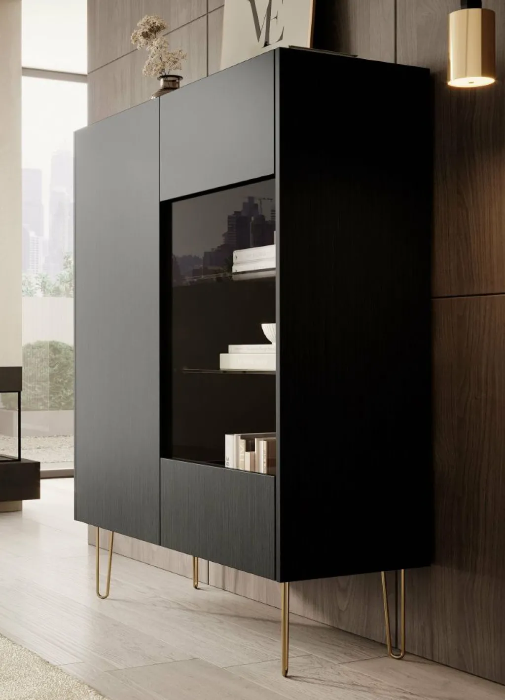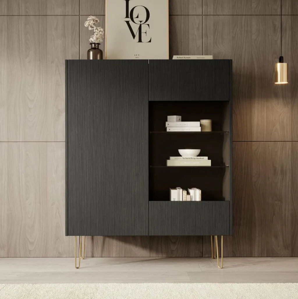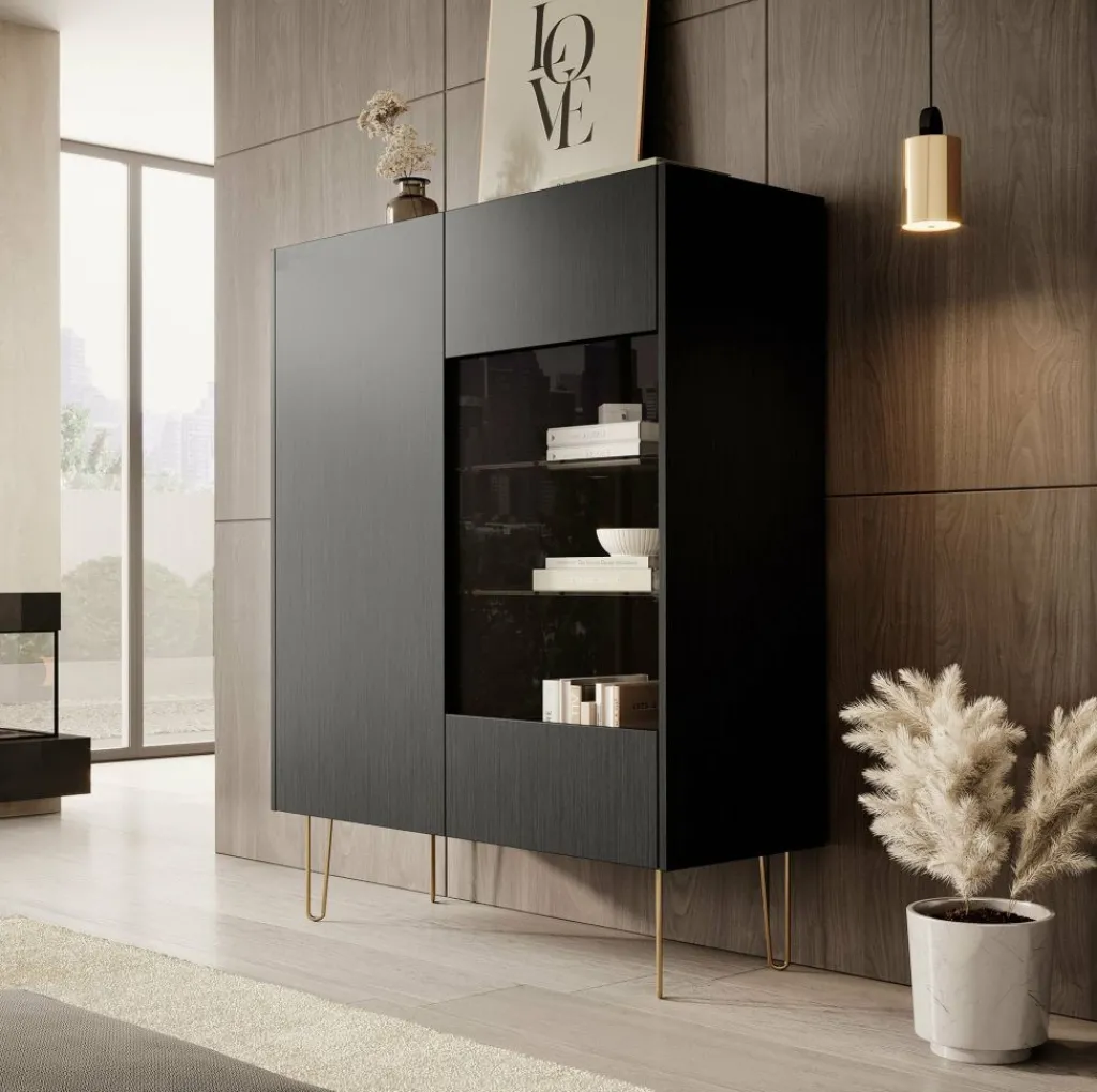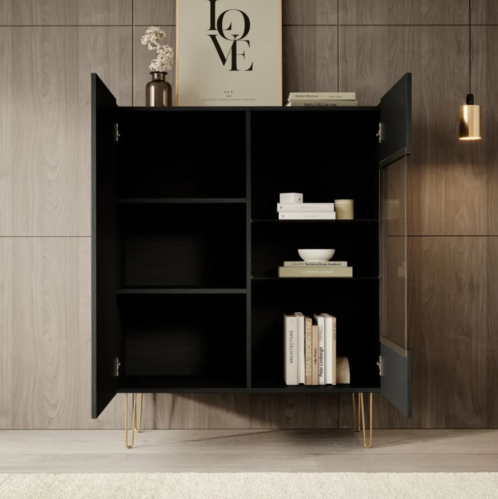 Opbergkast Hacienda is een praktisch vormgegeven kast, in moderne hotel-chique stijl. Het betreft een dichte opbergkast met twee deuren. De rechterdeur heeft in het midden een glasplaat. Het model is uitgevoerd in een zwart eiken kleur en staat op goudkleurige pootjes. Het bovenblad heeft een marmerlook.