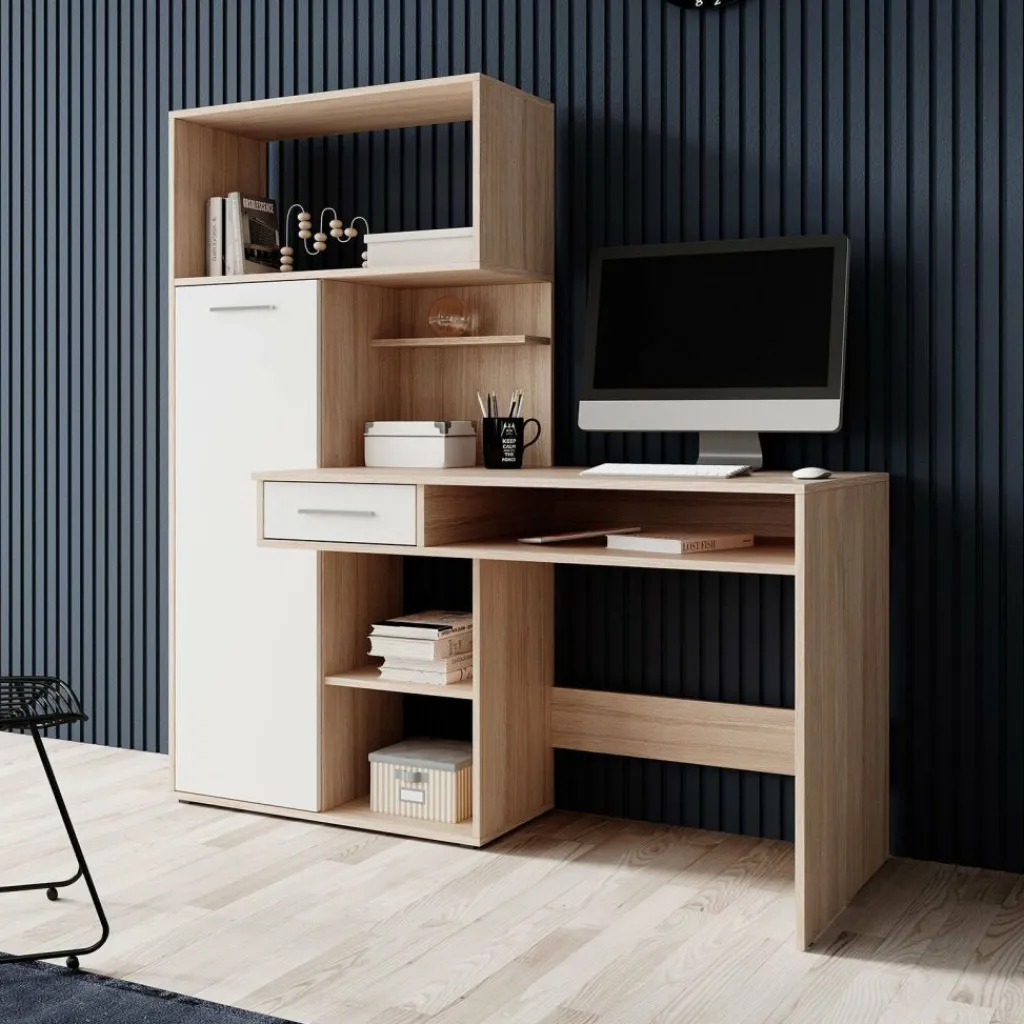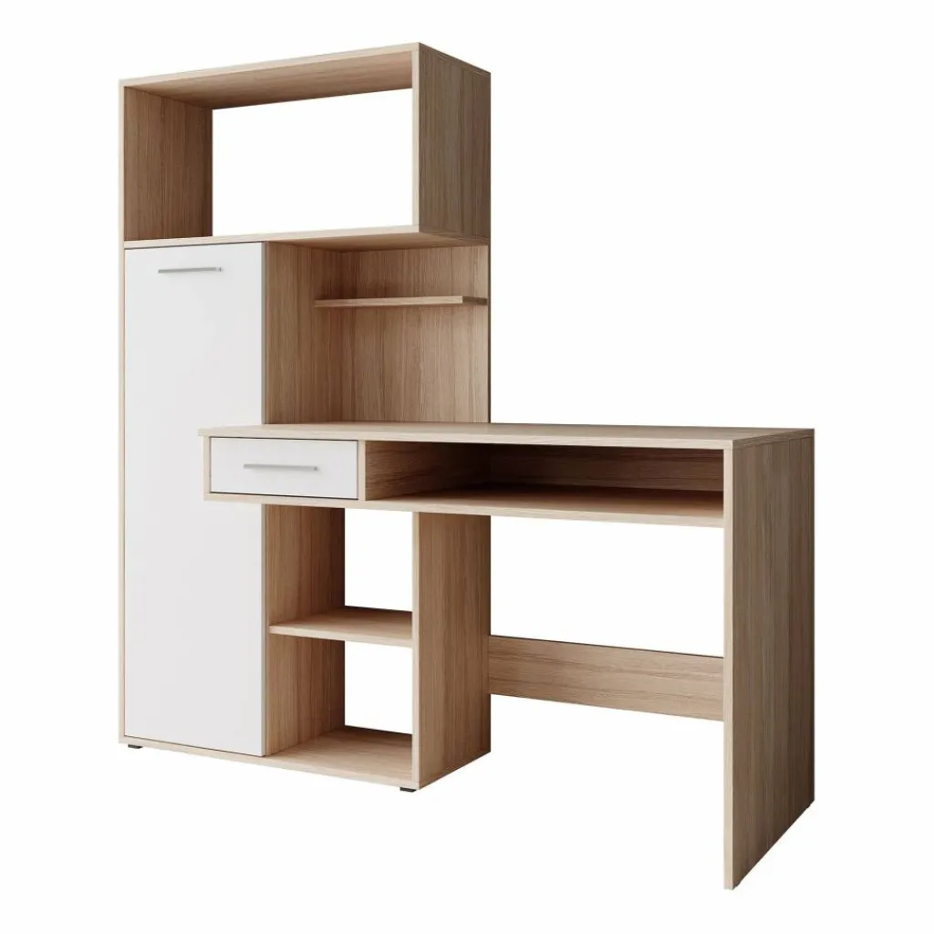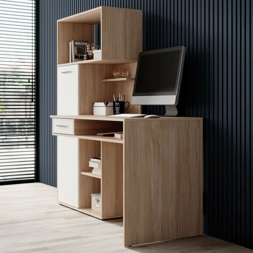 Bureau Harrah combineert een praktische indeling met een moderne uitstraling. De warme eiken kleur in combinatie met witte accenten geeft het meubel een fris en strak karakter – ideaal voor de werk- of studeerkamer.