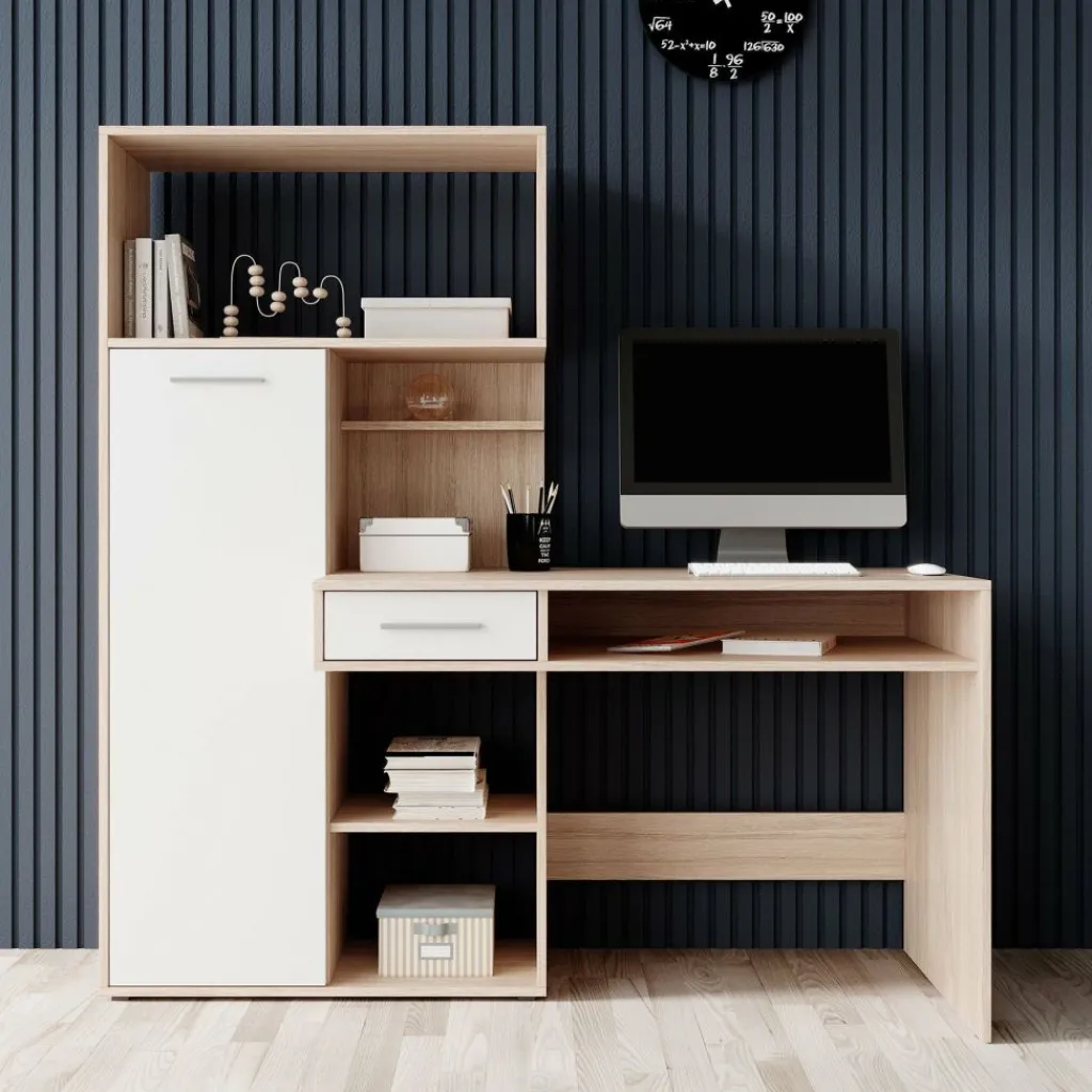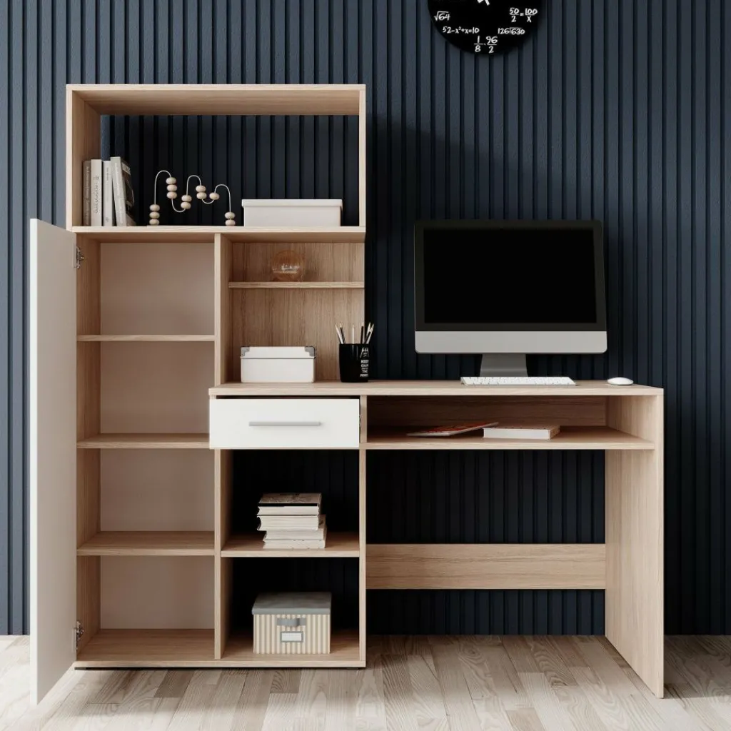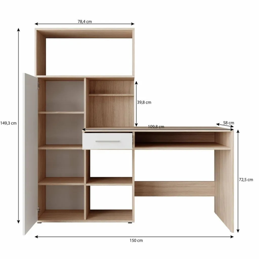 Het bureau is 150 cm breed en biedt veel werkruimte voor je laptop, beeldscherm en schrijfwaren. Dankzij de indeling met open vakken, een opberglade en een kast met deur kun je al je spullen overzichtelijk opbergen. Zo houd je je werkplek netjes én functioneel.