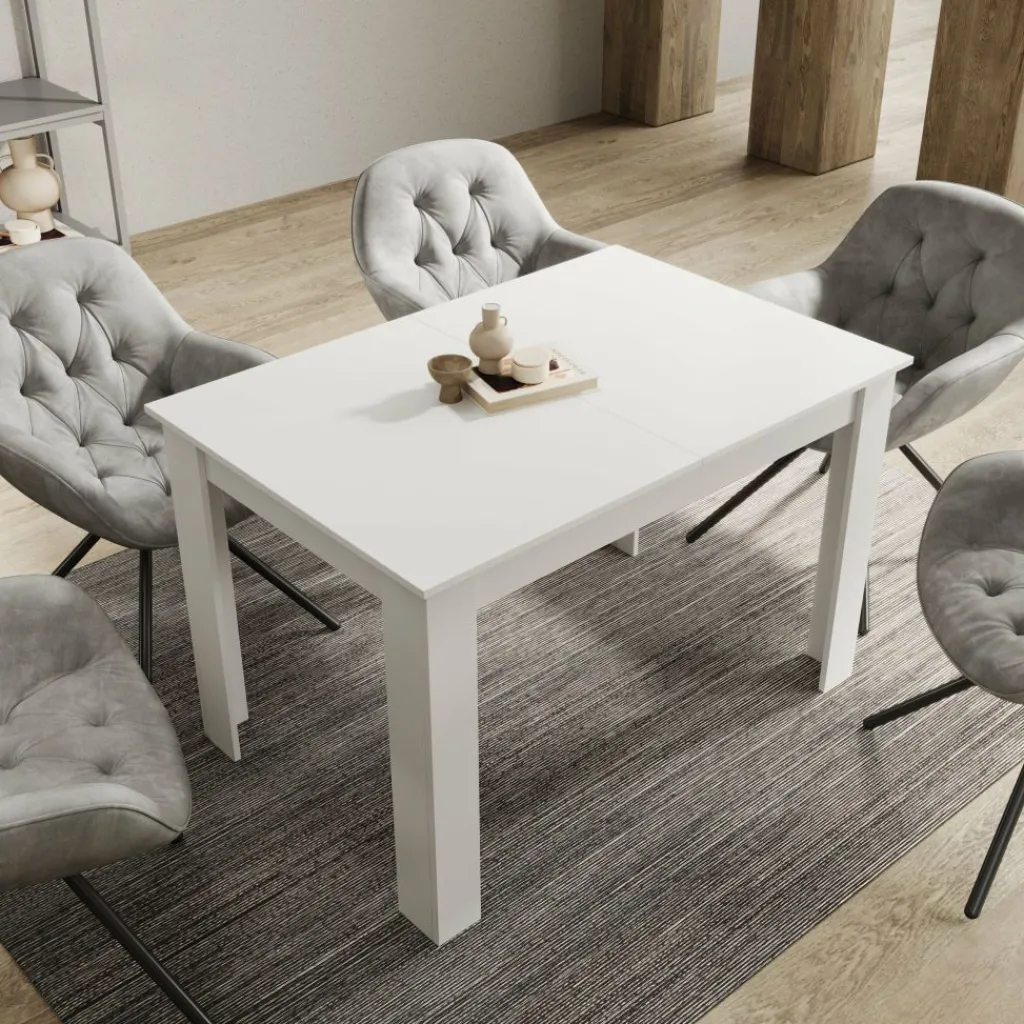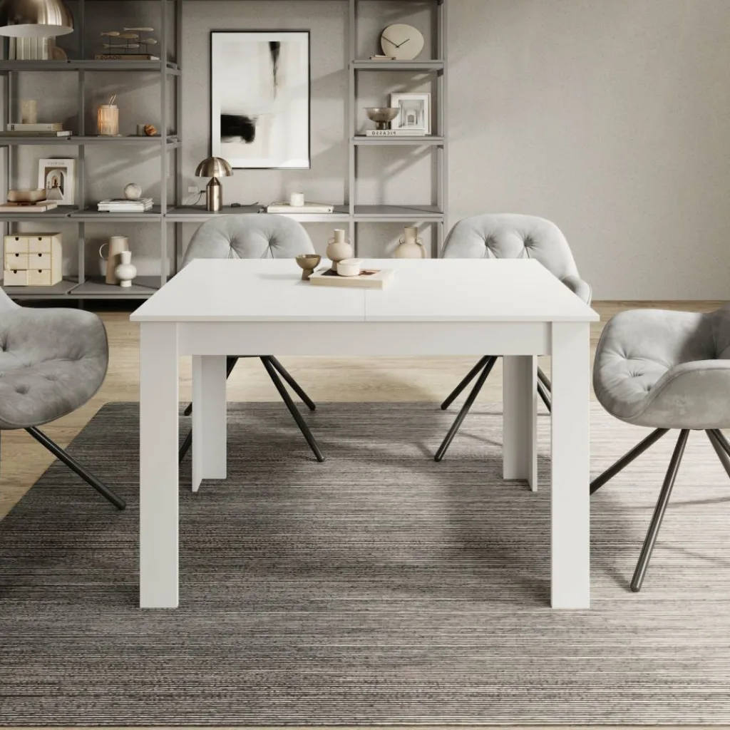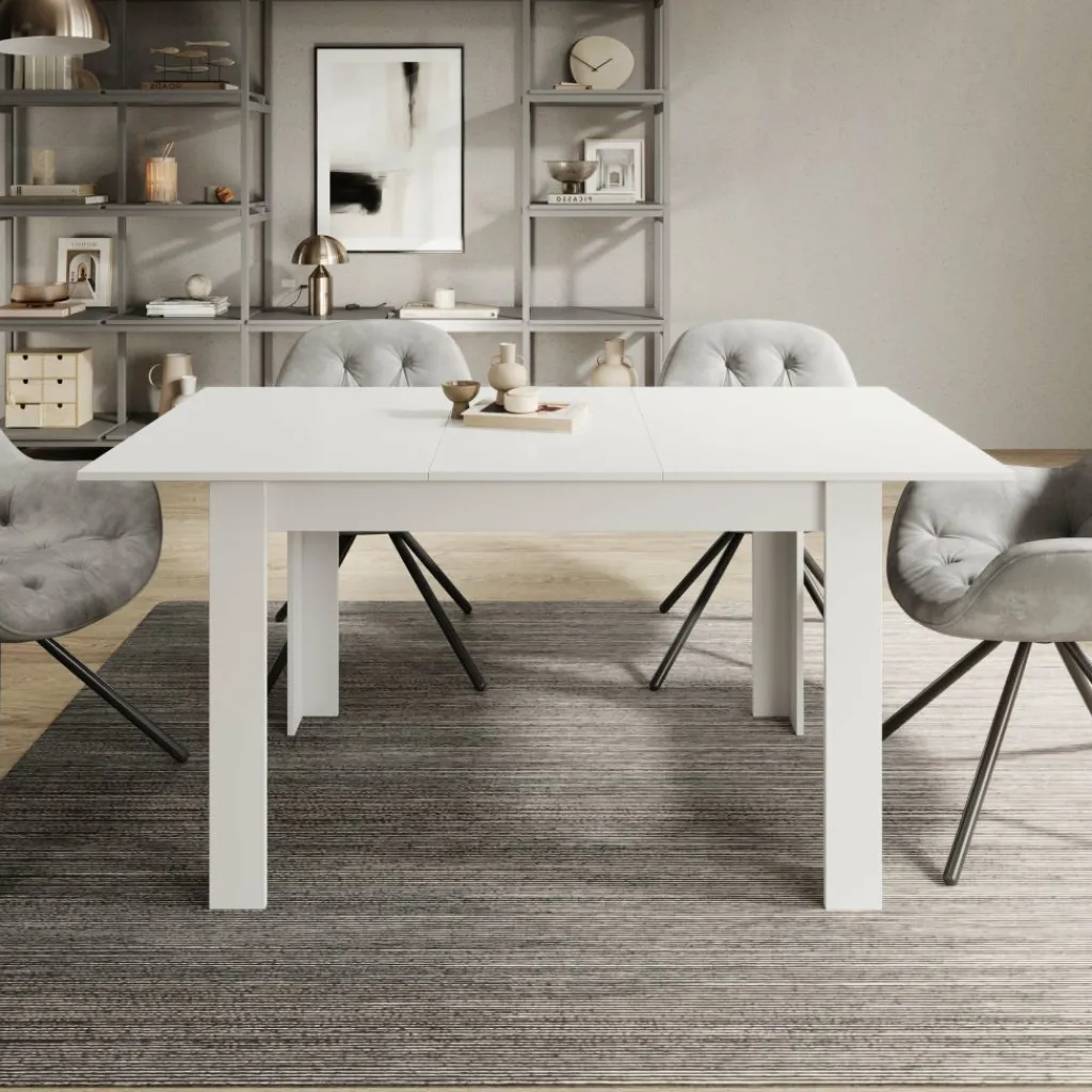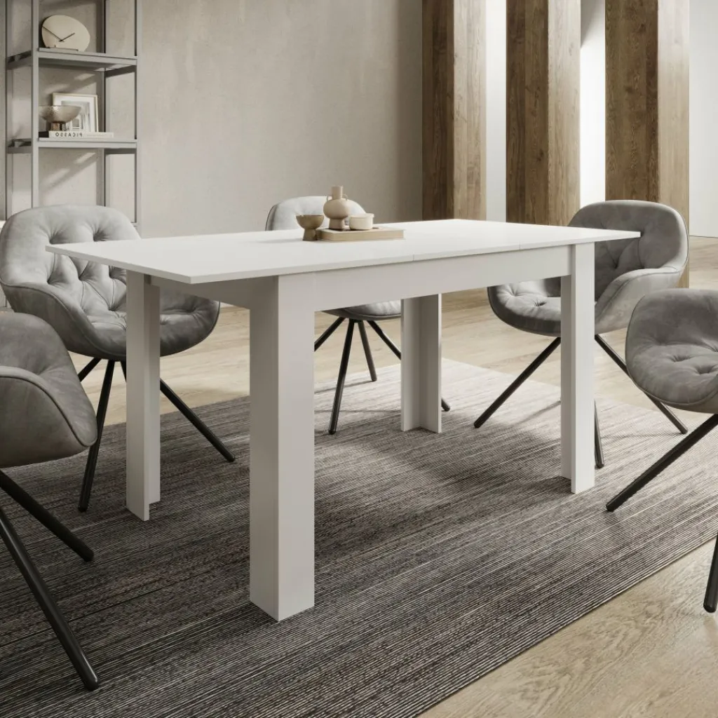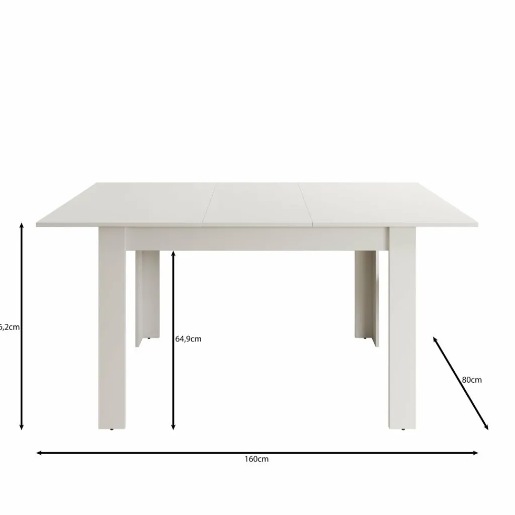 Dankzij het geïntegreerde verlengdeel is de tafel eenvoudig uit te schuiven tot 160 cm. Zo creëer je snel extra zitplaatsen wanneer je bezoek ontvangt of meer werkruimte nodig hebt. Het witte blad geeft de tafel een frisse, neutrale uitstraling en laat zich makkelijk combineren met verschillende stoelen en interieurs. De rechte poten en solide constructie zorgen voor een stabiele opstelling tijdens het eten of werken.