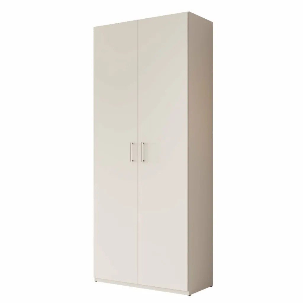 De kledingkast is gemaakt van spaanplaat en afgewerkt in wit, waardoor deze eenvoudig te combineren is met verschillende interieurstijlen. De gesloten deuren zorgen ervoor dat de inhoud netjes uit het zicht blijft en dragen bij aan een opgeruimde uitstraling.