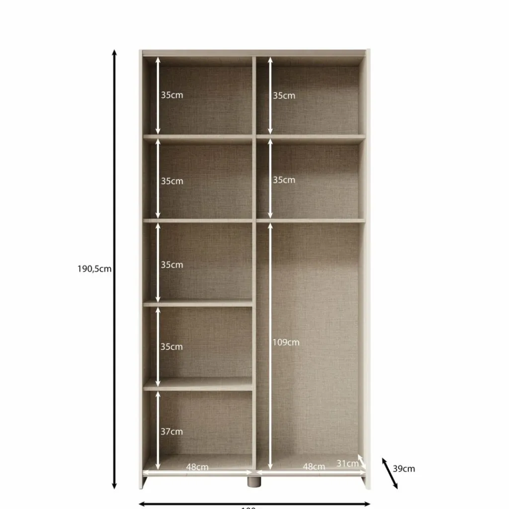Achter de schuifdeuren is de kast verdeeld in twee gedeeltes. Aan de linkerzijde bevinden zich meerdere legplanken, geschikt voor het opbergen van kleding, schoenen of opbergdozen. Aan de rechterzijde is een hanggedeelte aanwezig met een kledingroede voor het ophangen van jassen, jurken of overhemden. Deze indeling maakt de kast geschikt voor zowel hangende als gevouwen kleding.