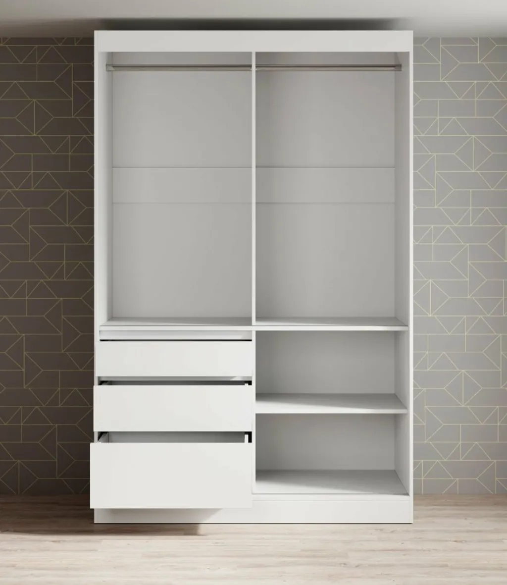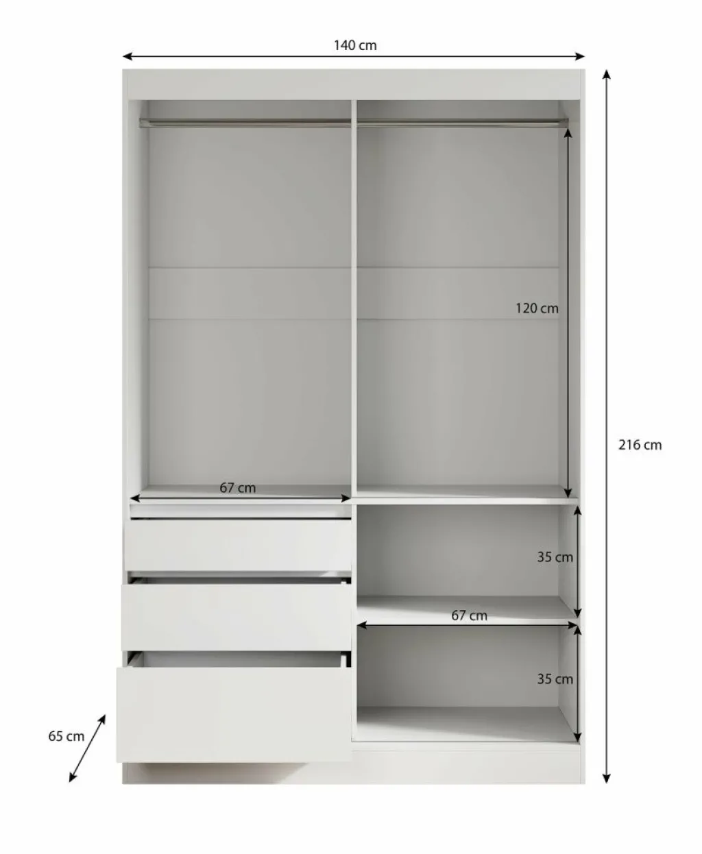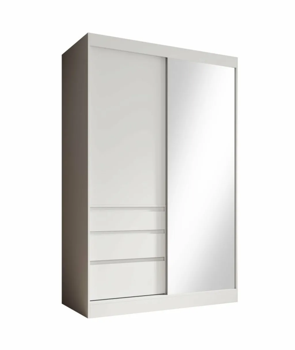 Kledingkast Henry is een garderobekast met ruime opbergmogelijkheden. Dit model is voorzien van 2 schuifdeuren. Op de rechterdeur bevindt zich een grote spiegel. Het binnenwerk bestaat uit 4 open schappen. Aan zowel de linker- en rechterzijde van de kast is er een mogelijkheid om kleding op te hangen op de daarvoor bestemde kledingstang. Daarnaast beschikt de kast over drie handige opberglades. Dit model is afgewerkt in een witte kleur.