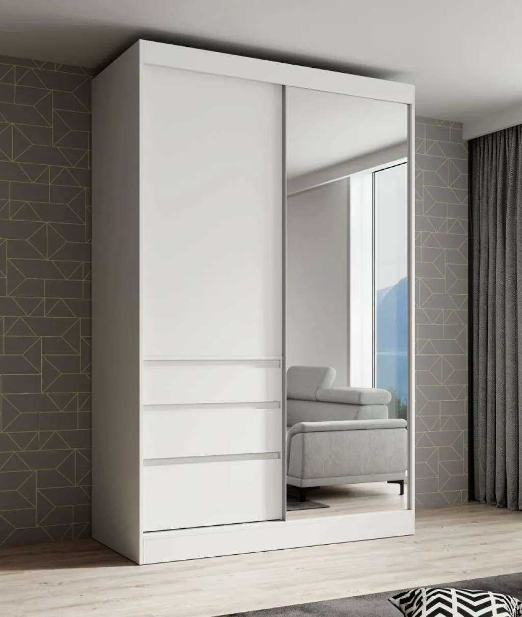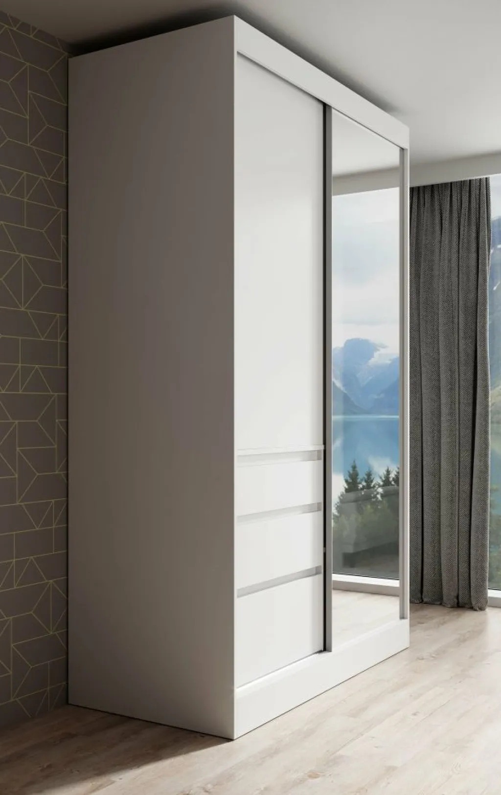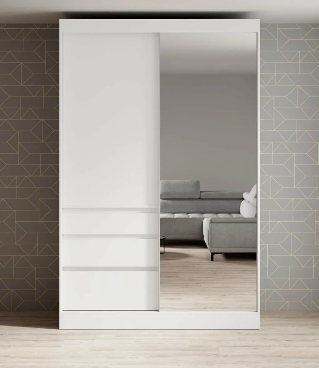 Kledingkast Henry is een garderobekast met ruime opbergmogelijkheden. Dit model is voorzien van 2 schuifdeuren. Op de rechterdeur bevindt zich een grote spiegel. Het binnenwerk bestaat uit 4 open schappen. Aan zowel de linker- en rechterzijde van de kast is er een mogelijkheid om kleding op te hangen op de daarvoor bestemde kledingstang. Daarnaast beschikt de kast over drie handige opberglades. Dit model is afgewerkt in een witte kleur.