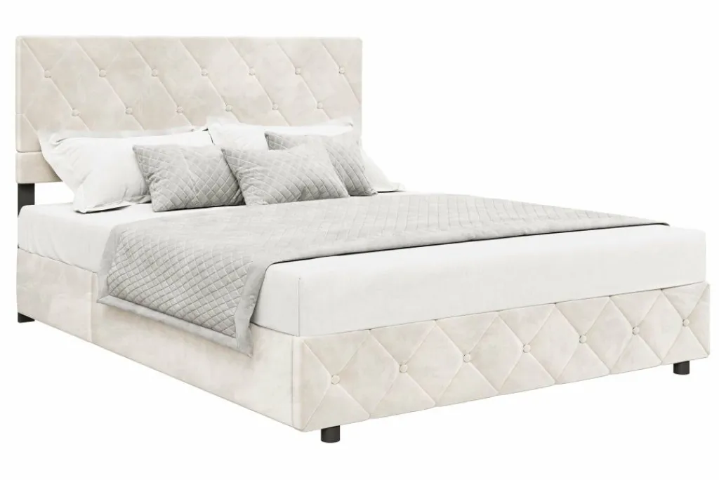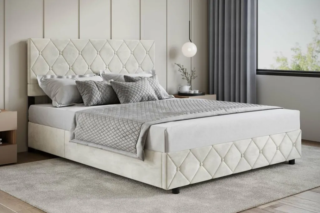 Tweepersoonsbed Hernandez is een bed geschikt voor matrasmaat 160×200 cm. Het meubel is gemaakt van een zachte velvet stof in de kleur beige. Het bed wordt geleverd zonder matras. De lattenbodem is wel inbegrepen. Deze lattenbodem beschikt over een gasliftsysteem. Hierdoor kan je de bodem omhoog kantelen zodat er opbergruimte ontstaat. Handig voor bijvoorbeeld kussens, beddengoed of dekens. Het hoofdbord en het voetenbord hebben een gecapitonneerde afwerking.