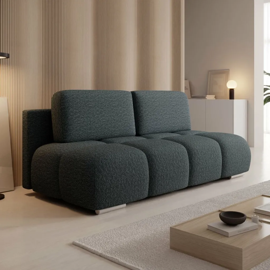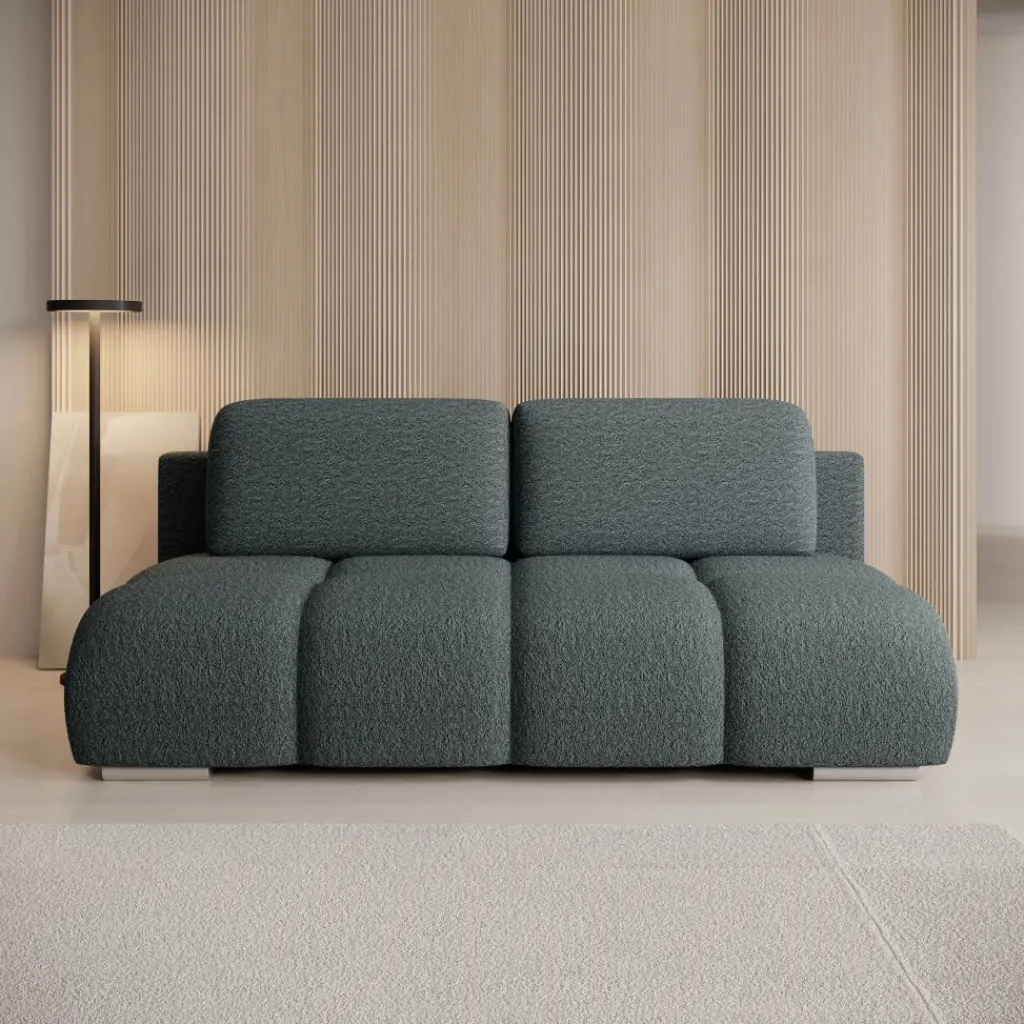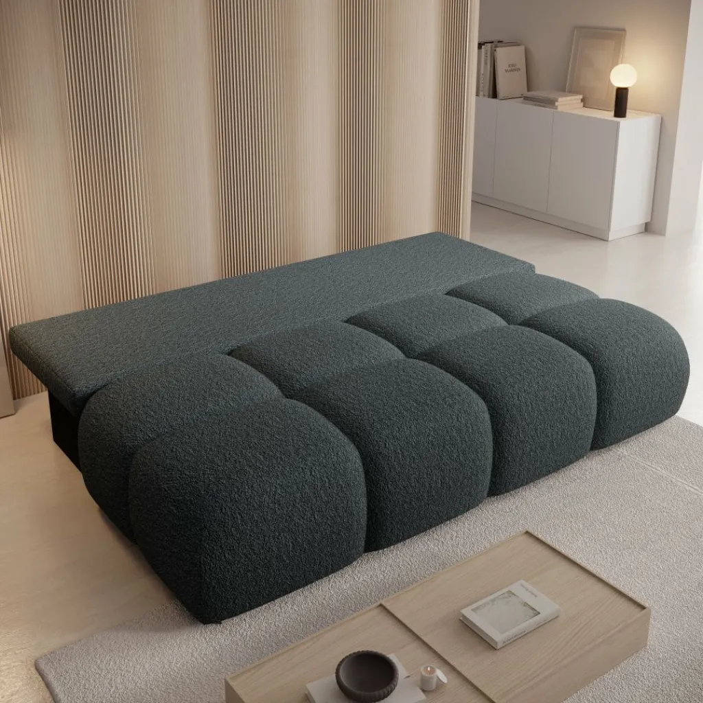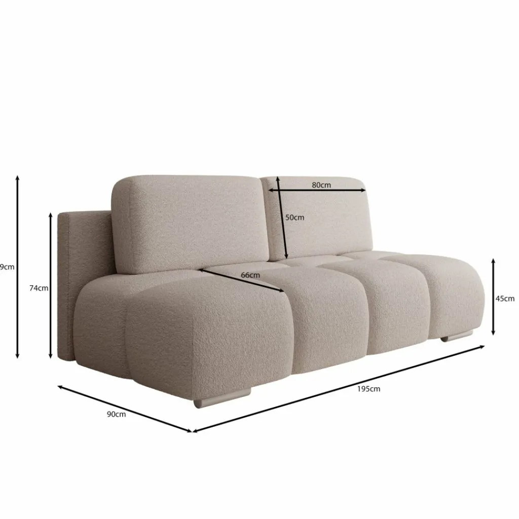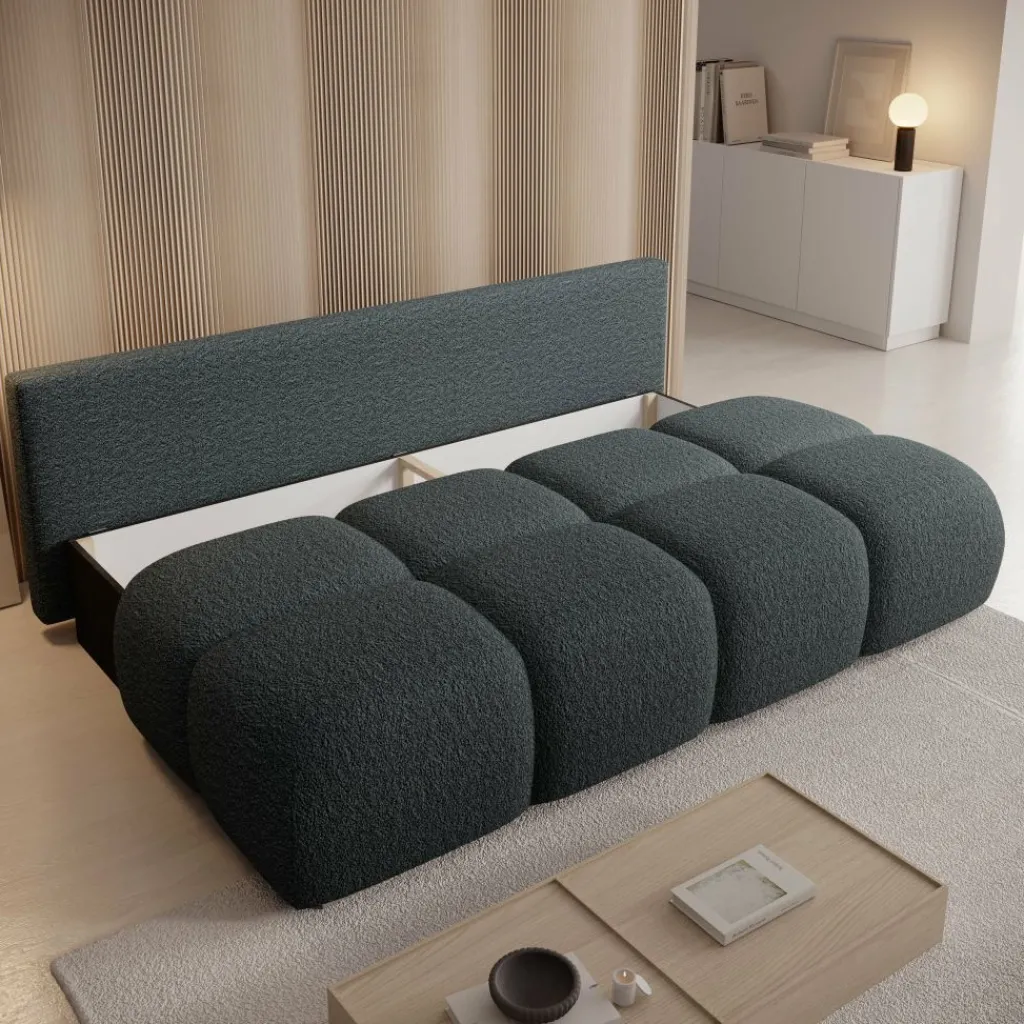 De slaapbank heeft een geïntegreerde opbergruimte onder de zitting, waar je beddengoed, kussens of andere items netjes kunt opbergen. De afgeronde zitting en rugleuning zorgen voor een comfortabele zit, terwijl de structuur van de teddystof zorgt voor een rustige, neutrale uitstraling die goed aansluit bij moderne interieurs. Dankzij het compacte ontwerp past de bank goed in verschillende woonopstellingen en is hij geschikt voor dagelijks gebruik.