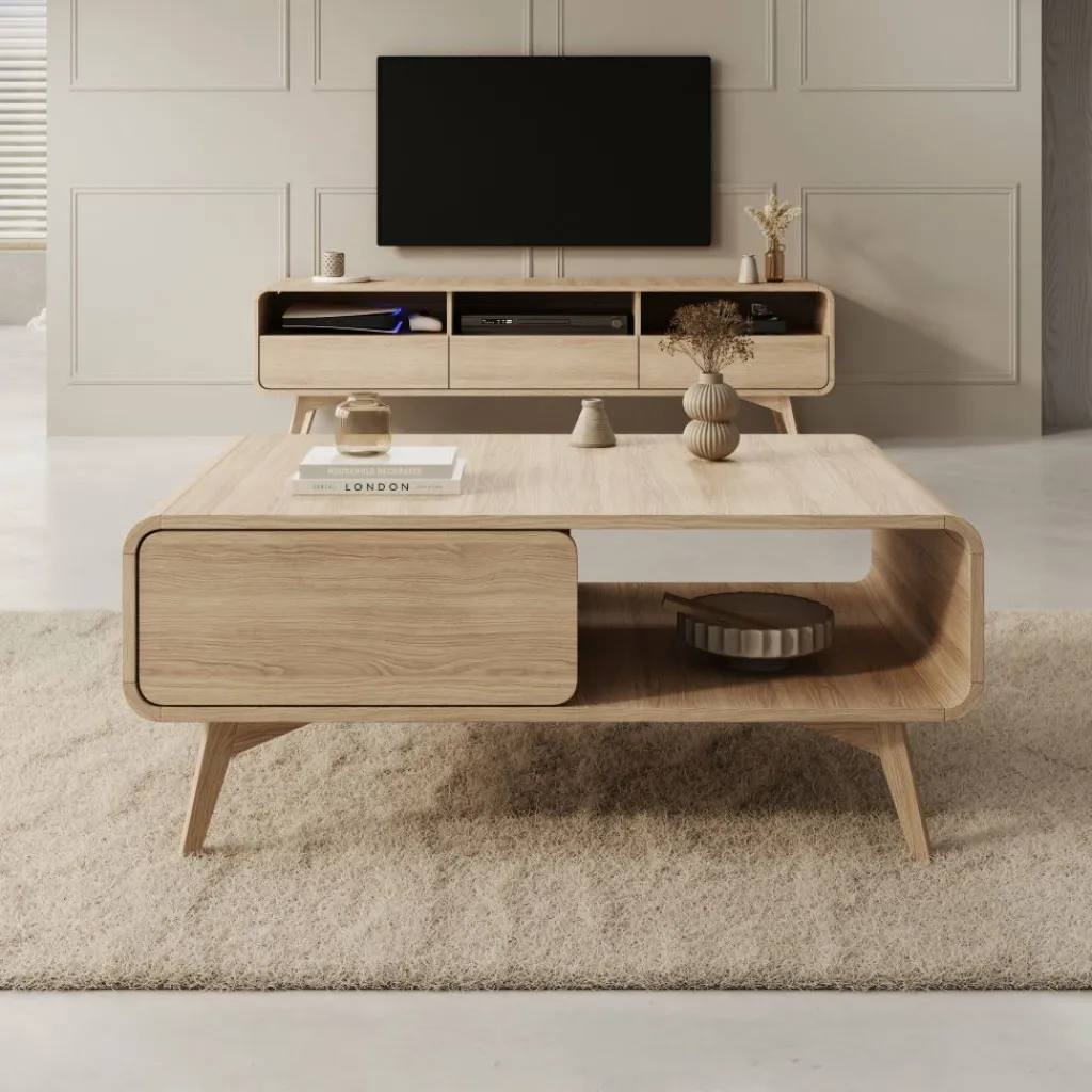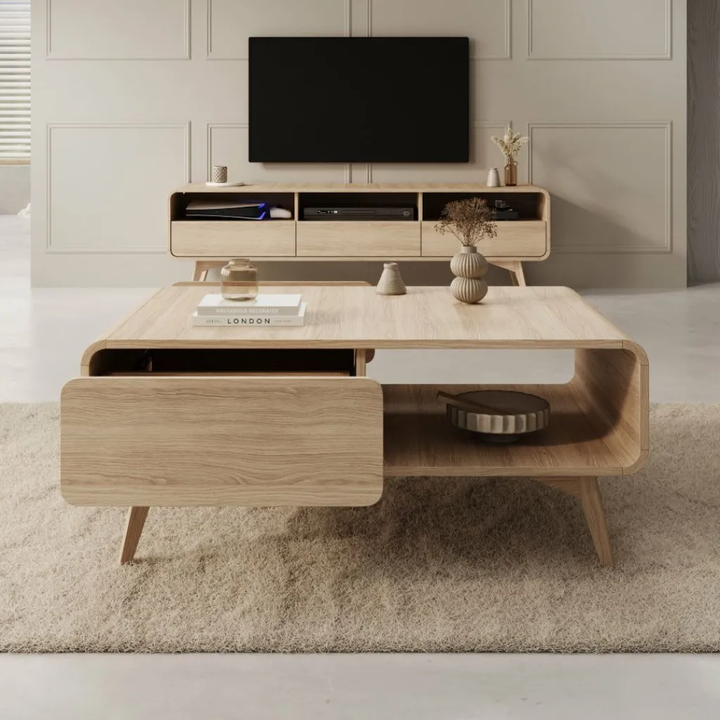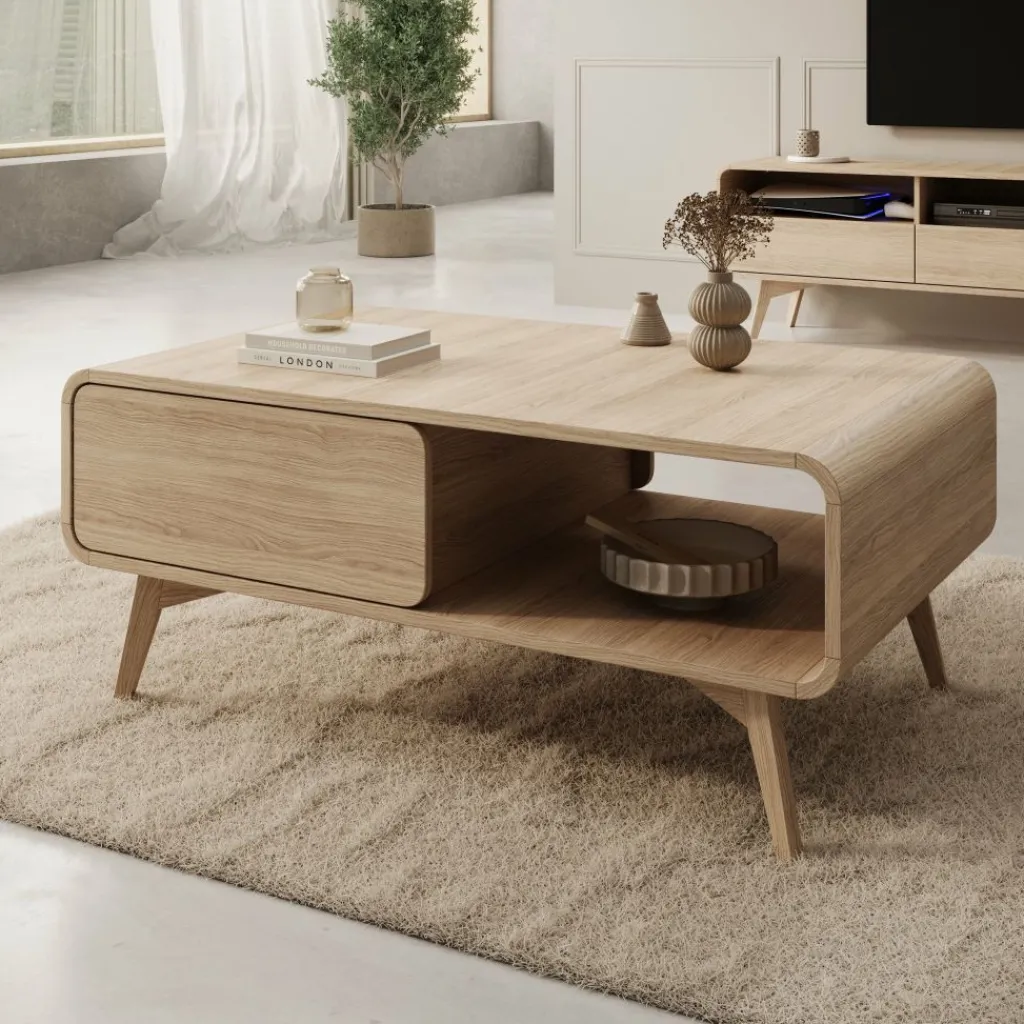 Op het blad is voldoende ruimte voor dagelijkse spullen zoals afstandsbedieningen, boeken of decoratie. De lade biedt plek voor kleinere items die je uit het zicht wilt bewaren, terwijl het open vak geschikt is voor tijdschriften of accessoires die je snel wilt pakken. De uitvoering in donker eikenpatroon laat een duidelijke houttekening zien en past goed bij warme woonkamers.