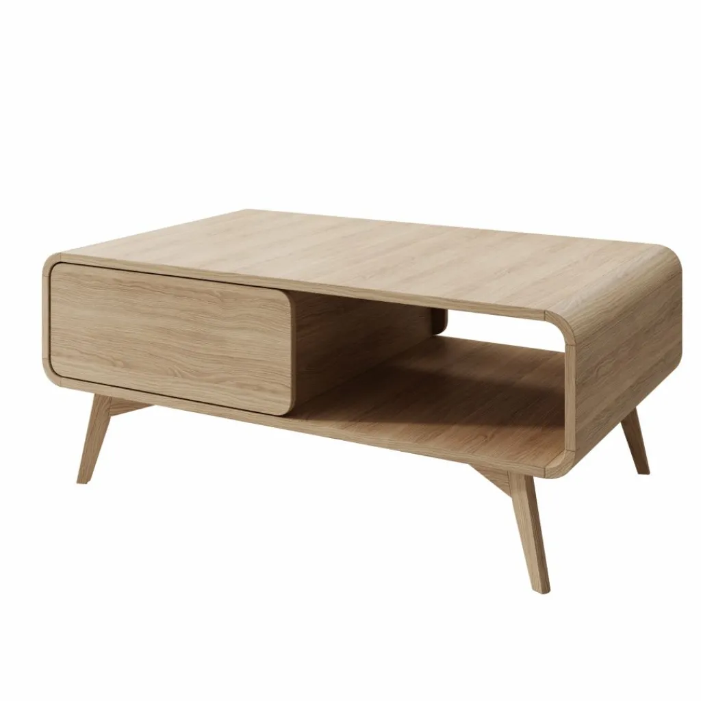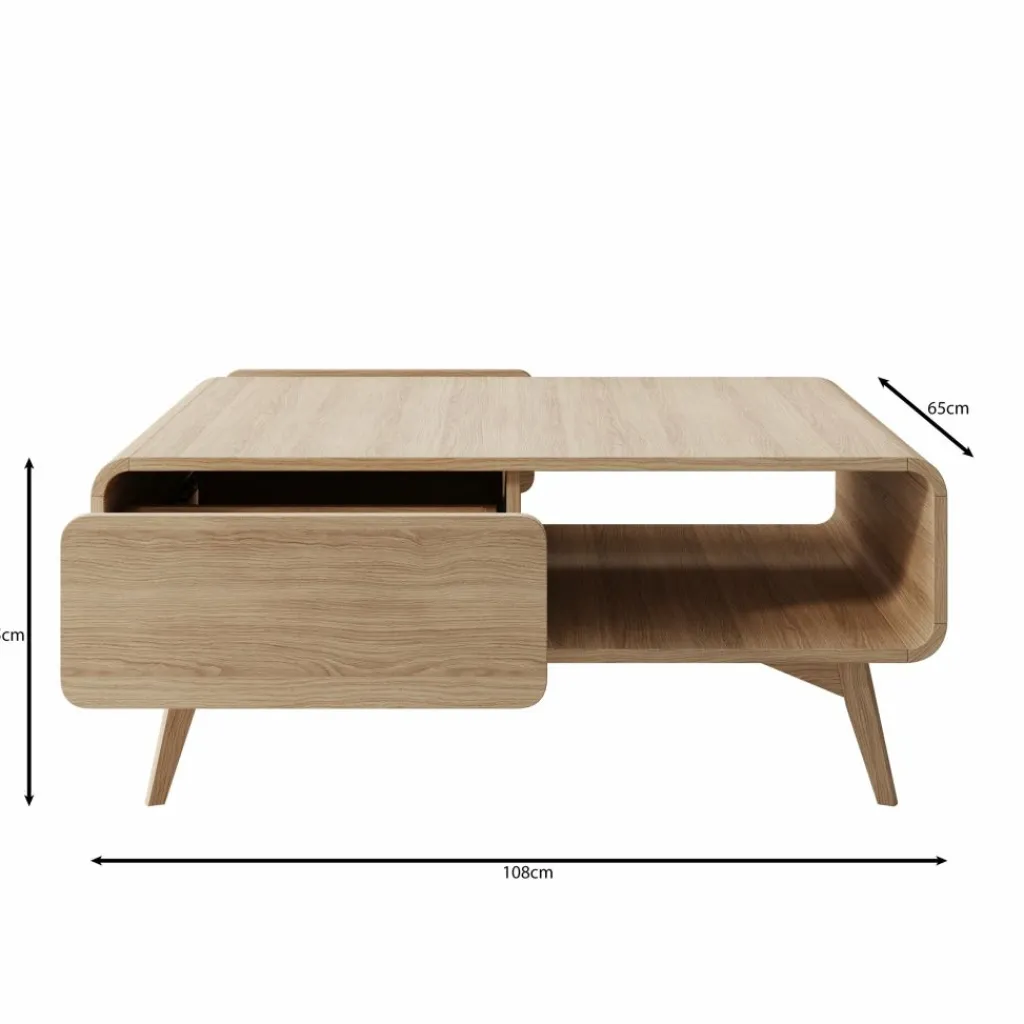 De Hoshii salontafel is een staand meubel met een breedte van 108 cm, een diepte van 65 cm en een hoogte van 45 cm. De tafel staat op schuine poten en heeft afgeronde hoeken, met aan één zijde een lade en aan de andere zijde een open opbergvak.