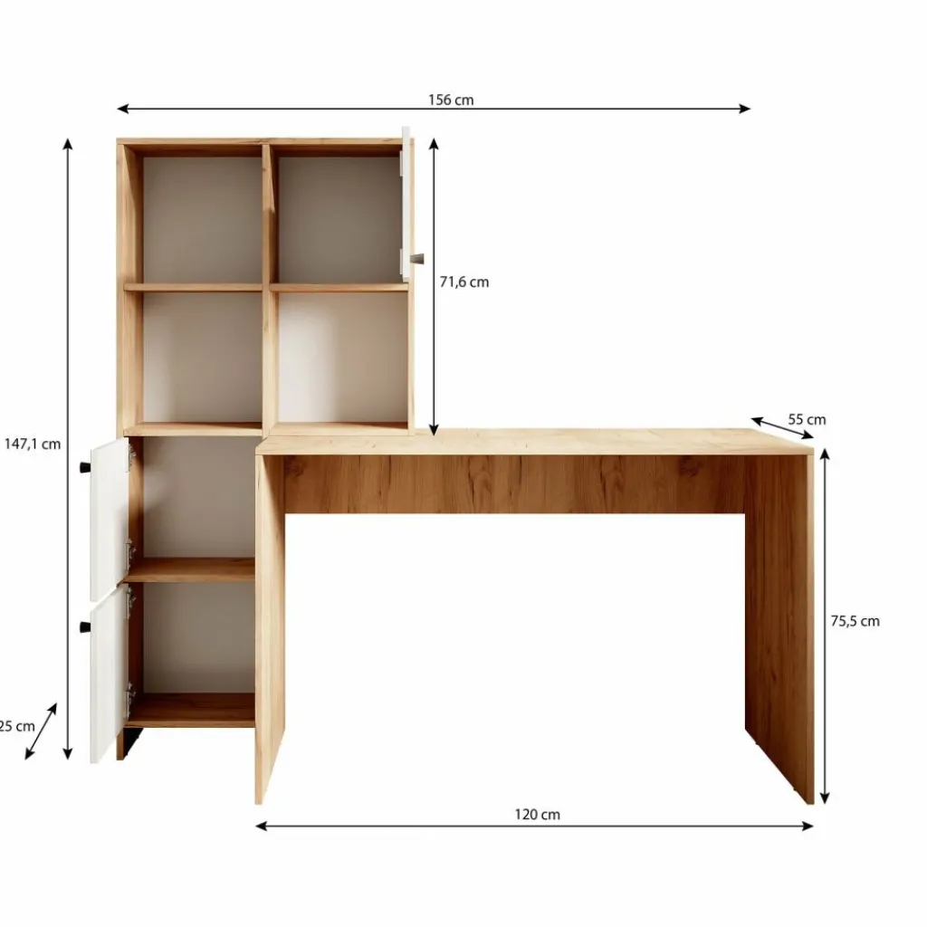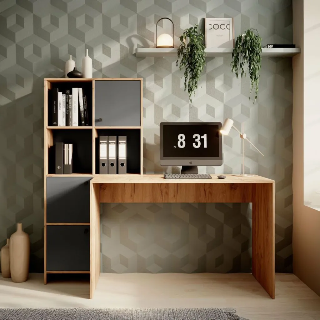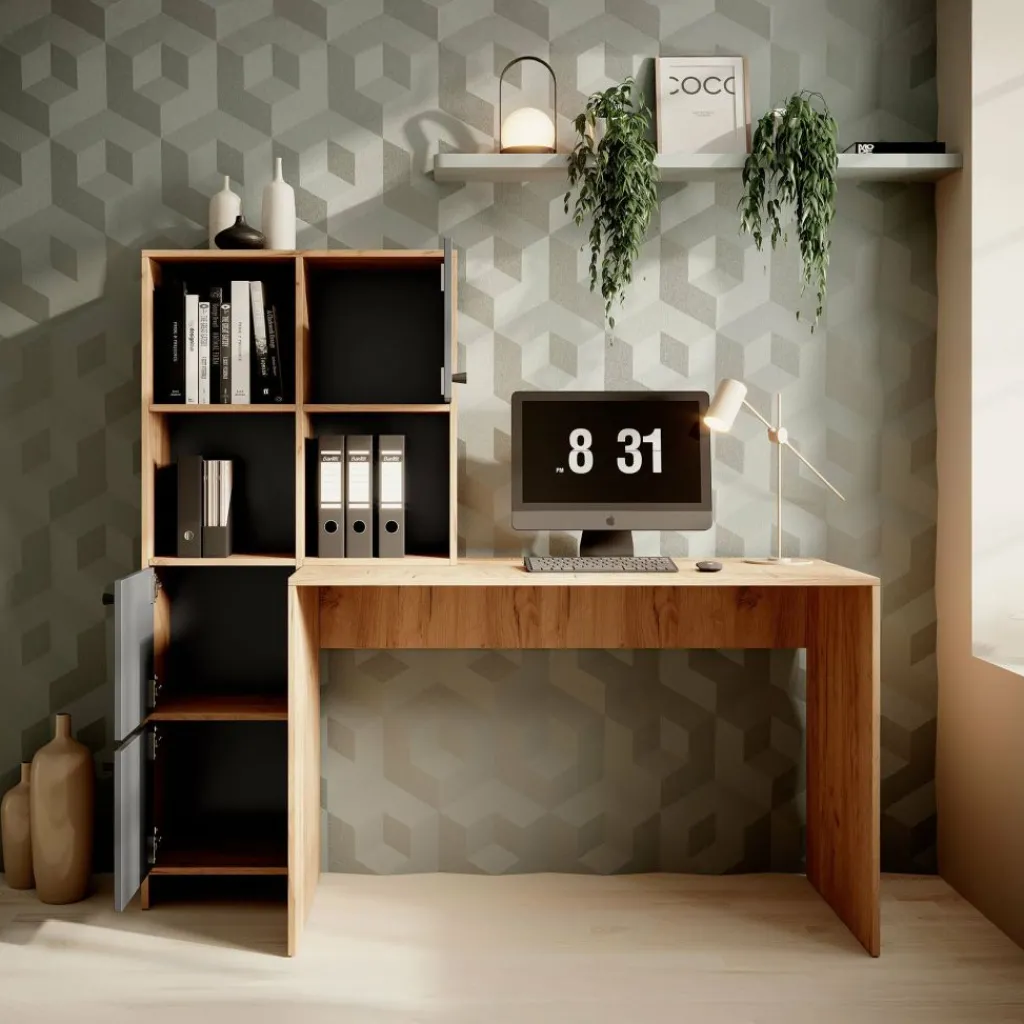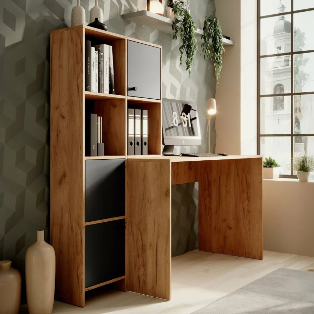 De Hyatt is een zeer multifunctioneel bureau. Het meubel bestaat namelijk uit een breed blad met aan de linkerkant 3 deurtjes en 3 open schappen. Het bureau is uitgevoerd in eiken met antraciet.