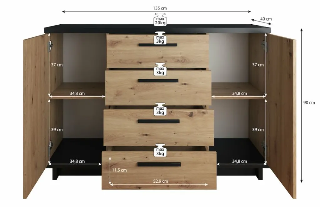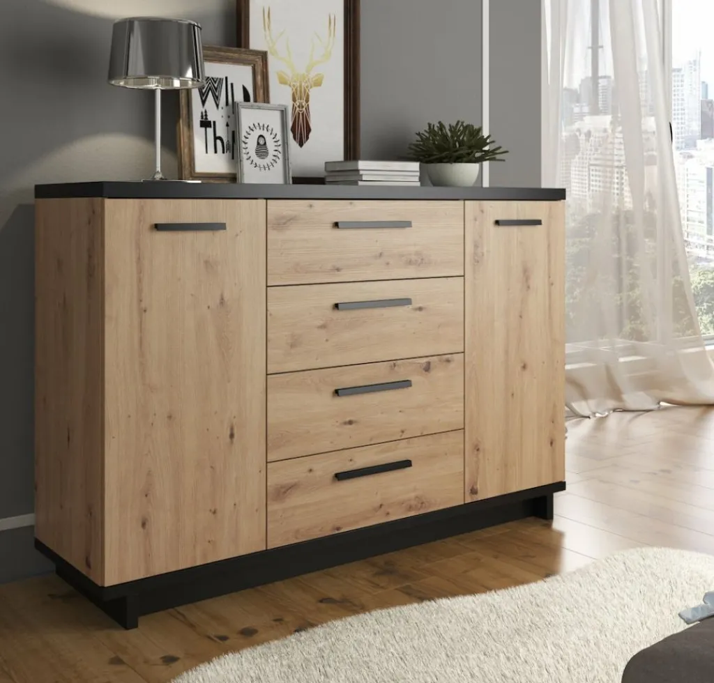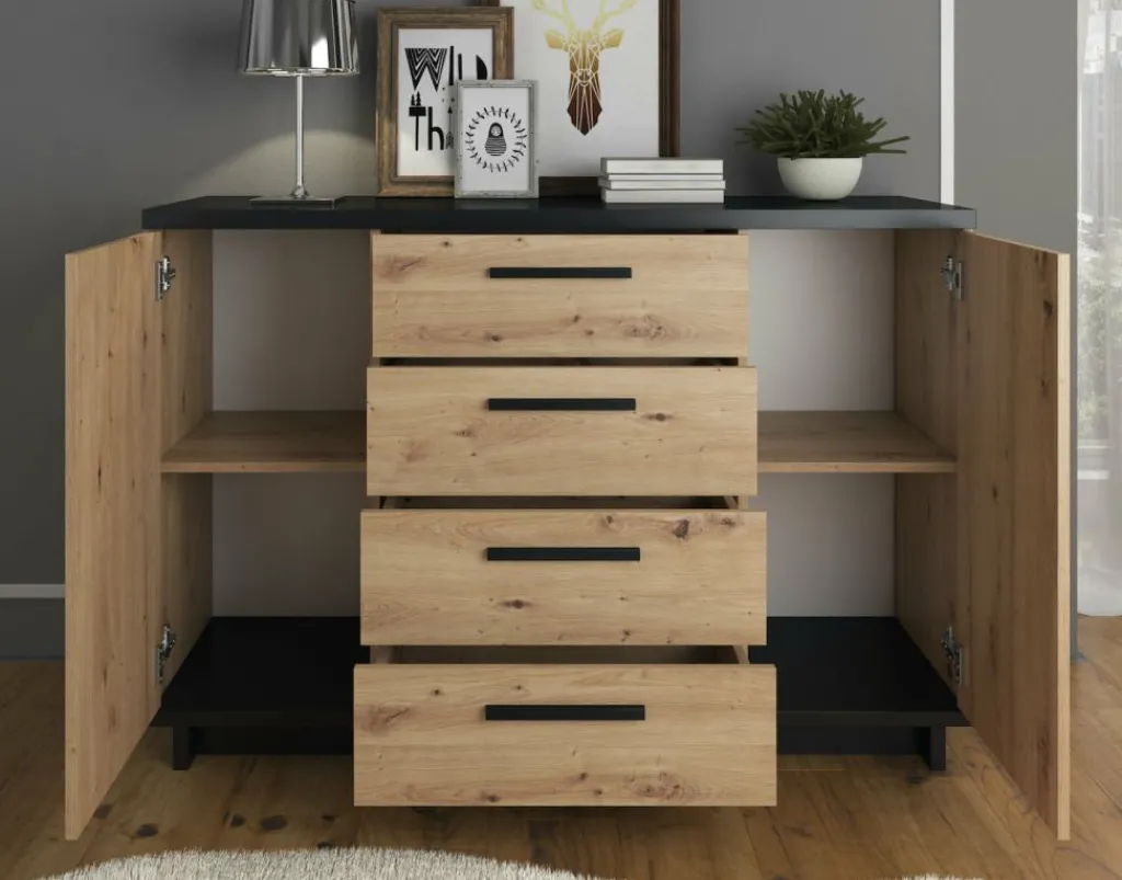 Dressoir Incala is een kast met een moderne industriële uitstraling. Het meubel is uitgevoerd in een eiken kleur met mat zwarte bovenplaat. De ladekast beschikt over 4 lades en 2 deuren. Op de deuren en lades zitten handgrepen in zwarte kleur.