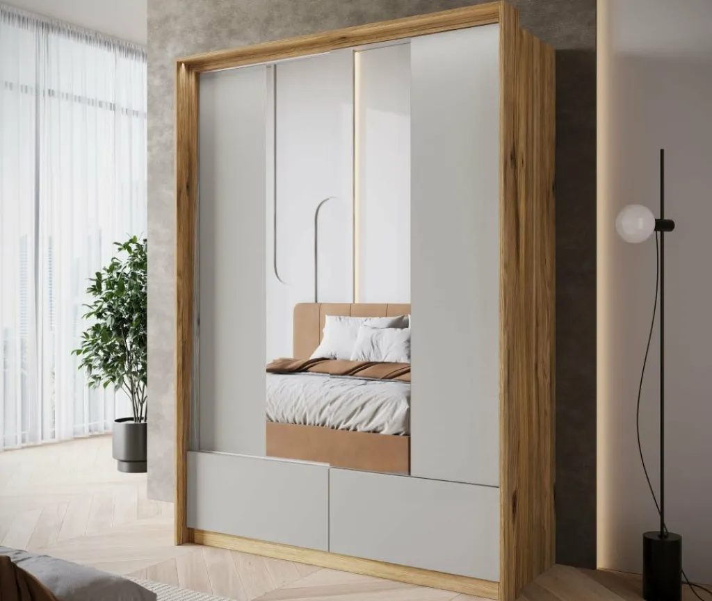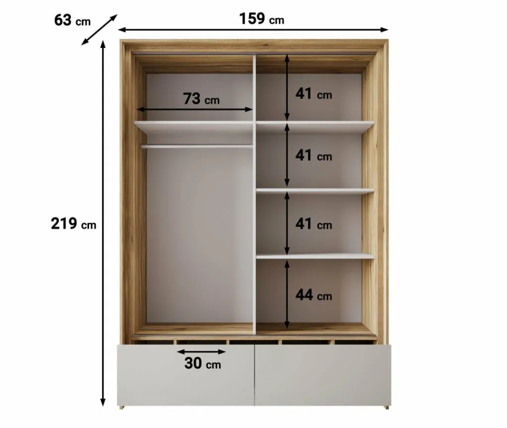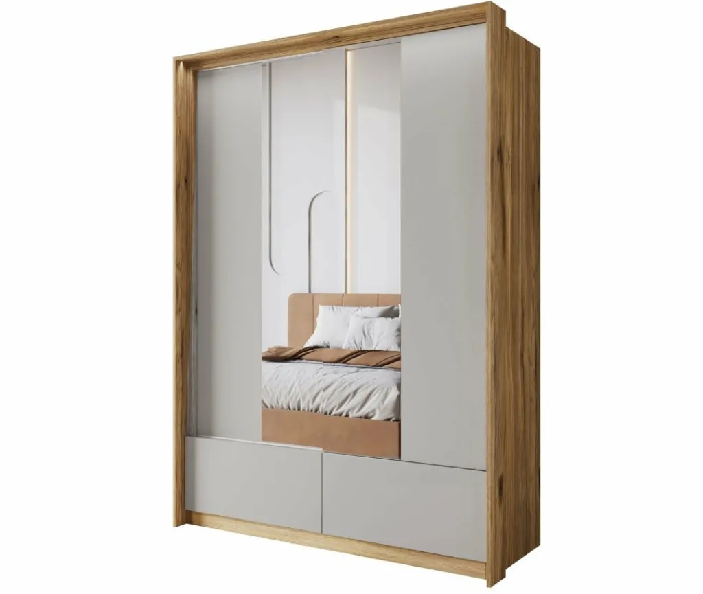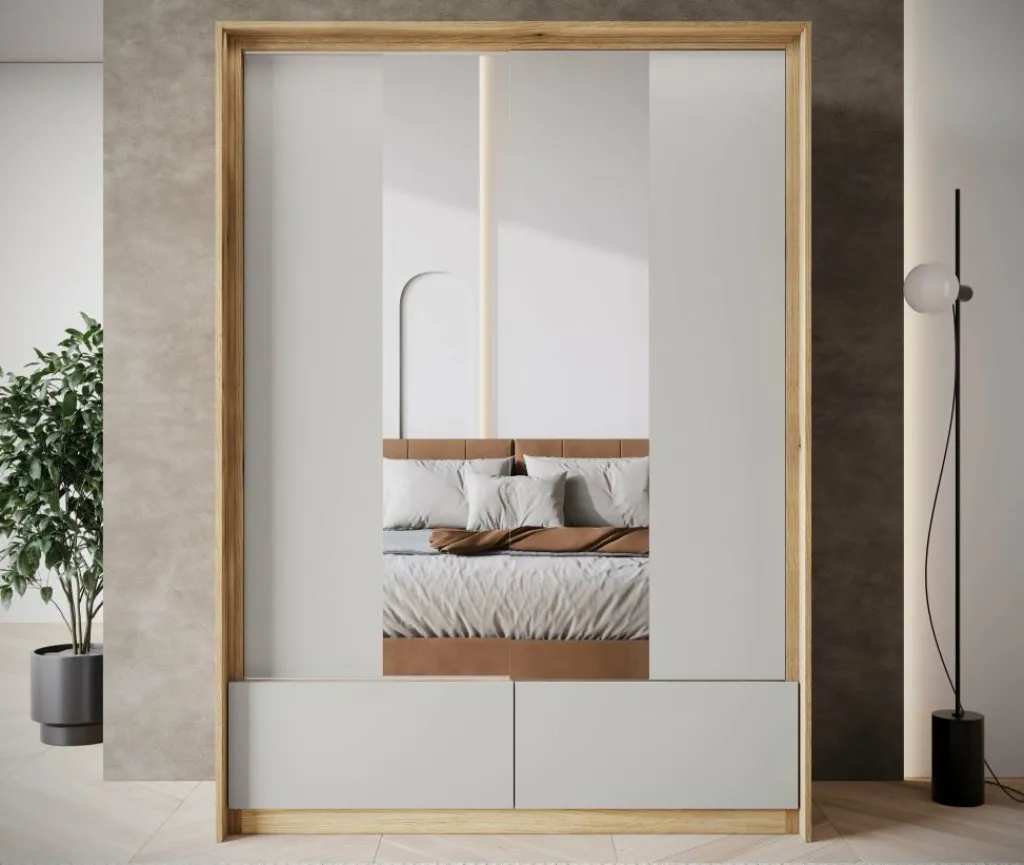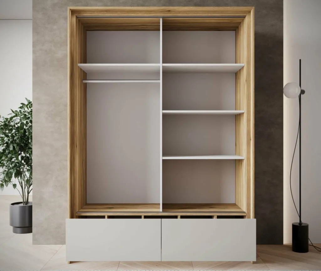 Kledingkast Innocent is een garderobekast met ruime opbergmogelijkheden in een moderne stijl. De kast is uitgevoerd in een beige kleur. Dit model is voorzien van 2 schuifdeuren. Beide deuren zijn voor de helft voorzien van een spiegel. Onder de deuren zitten nog 2 handige lades die een beige voorkant hebben. De binnenkant van de kast bestaat uit 5 opbergvakken en 1 kledingroede.