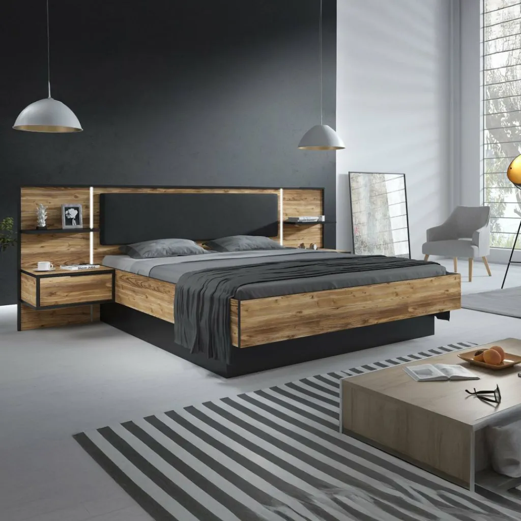 Het bed (299,5 × 208,7 cm) is geschikt voor een matras van 180 × 200 cm en wordt geleverd inclusief twee geïntegreerde nachtkastjes. De brede achterwand is voorzien van LED-verlichting en een zacht gestoffeerd kussen, wat zorgt voor extra comfort én sfeer. De lattenbodem en matras zijn niet inbegrepen.