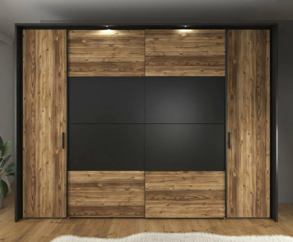 De bijpassende kledingkast (279,4 × 61,2 × 214,4 cm) heeft een praktische indeling met twee schuifdeuren en twee scharnierdeuren. De strakke, zwarte handgrepen geven het geheel een moderne look. Binnenin vind je twaalf opbergvakken en twee kledingroedes: ideaal voor zowel liggende als hangende kleding.