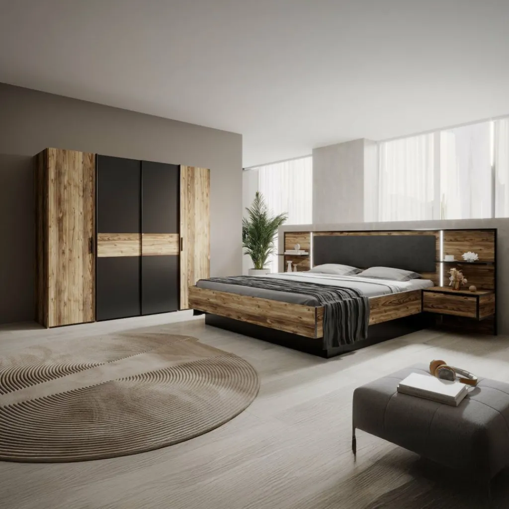 Deze compacte set bestaat uit een ruim tweepersoonsbed met geïntegreerde nachtkastjes én een bijpassende kledingkast.