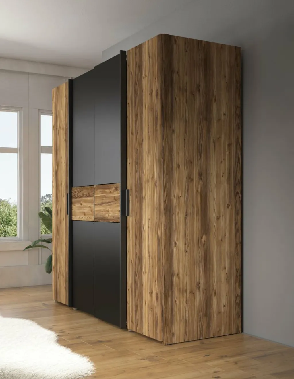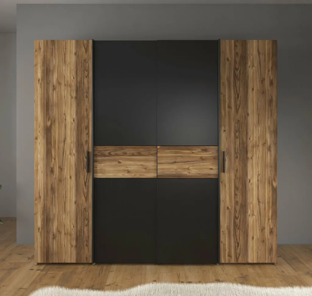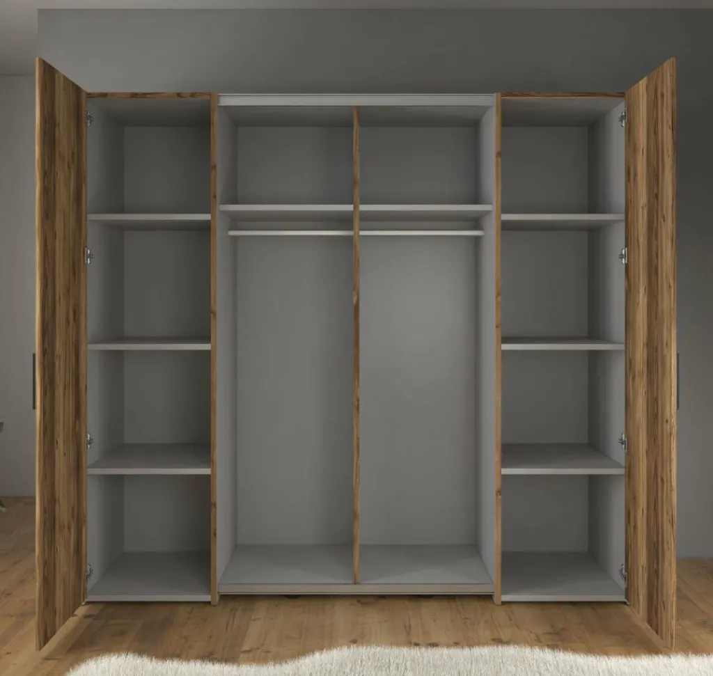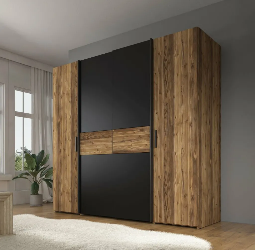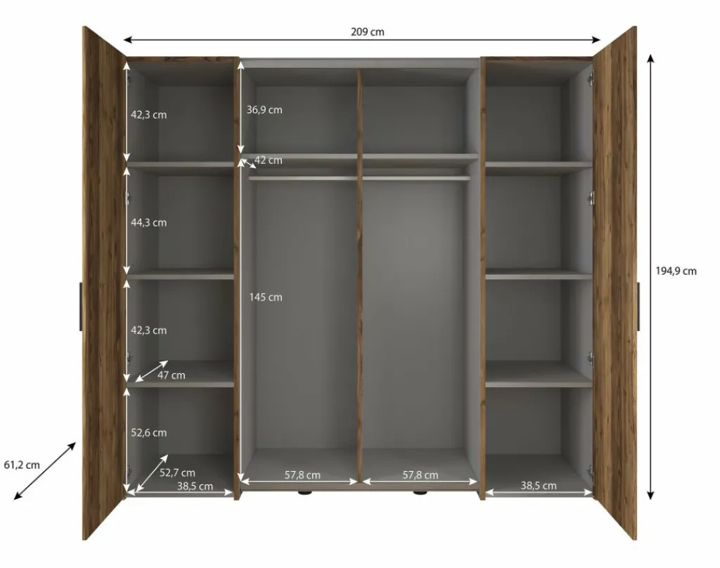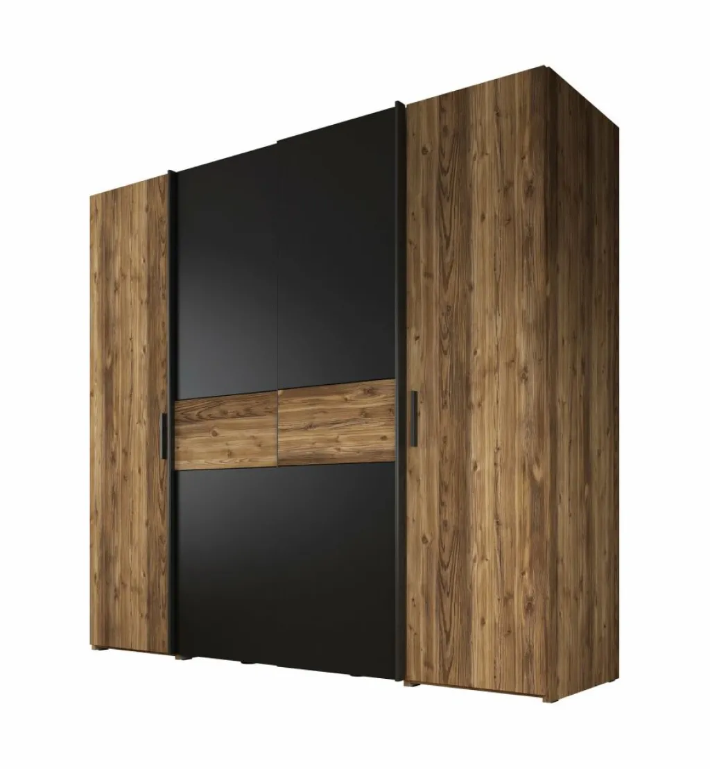 De kledingkast (209 x 61 x 195 cm) beschikt over 2 scharnierdeuren en 2 schuifdeuren, afgewerkt met strakke zwarte handgrepen. De kast biedt volop opbergruimte dankzij 10 vakken en 2 kledingstangen.