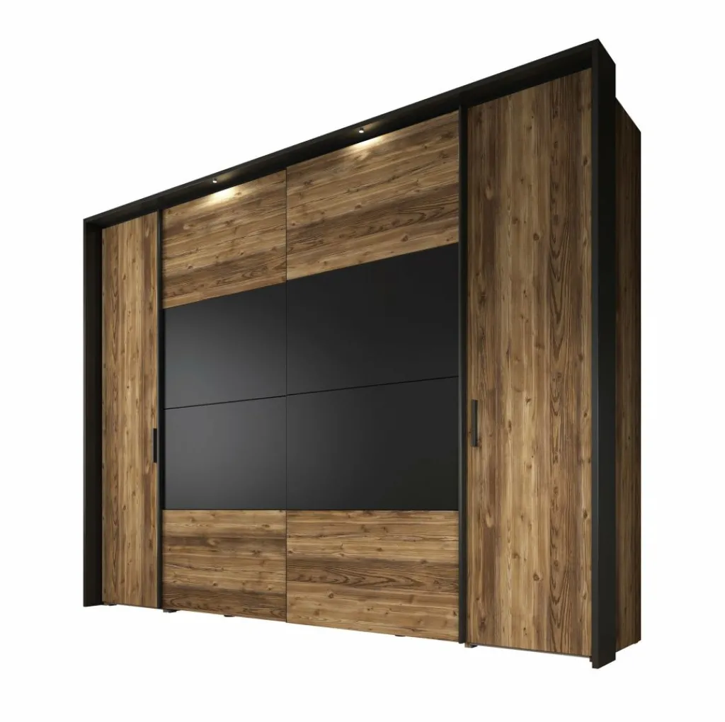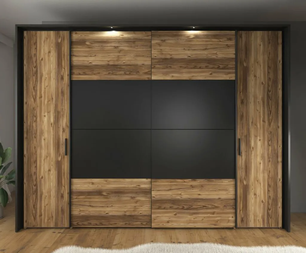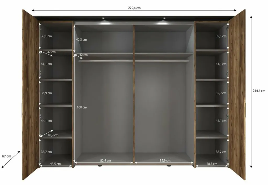 Kledingkast Jacob is een garderobekast met ruime opbergmogelijkheden. Dit model is voorzien van 2 grote schuifdeuren en 2 klapdeuren. Aan de binnenkant van de kast bevinden zich 2 kledingstangen om kleding op te hangen. Daarboven zitten 2 ruime schappen. Aan beide kanten zitten nog eens 5 opbergvakken. Dit model is afgewerkt in eiken kleur met mat zwarte details.