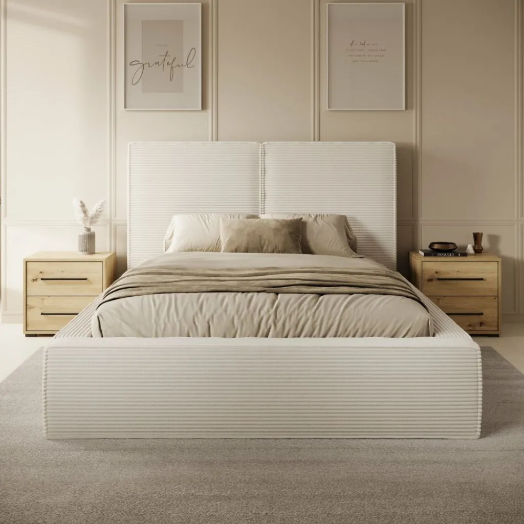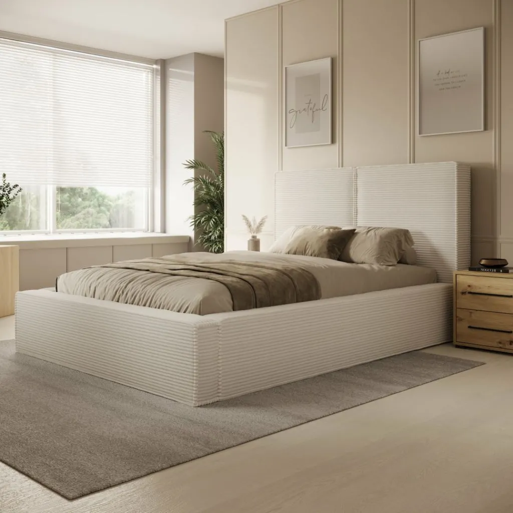 Het tweepersoonsbed Jarviz in beige ribstof combineert comfort en stijl in één ontwerp. De zachte ribstofbekleding geeft het bed een warme en moderne uitstraling, terwijl het strakke design zorgt voor een rustige en tijdloze sfeer in de slaapkamer.