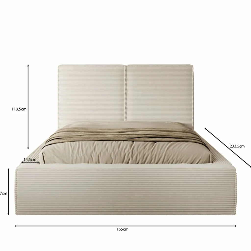 Met een ligoppervlak van 140×200 cm is dit bed perfect voor kleinere slaapkamers of voor wie graag knus samen slaapt. Het brede hoofdbord, uitgevoerd in dezelfde ribstof, maakt het bed niet alleen comfortabel om tegenaan te leunen, maar geeft ook een luxueuze uitstraling aan het geheel.