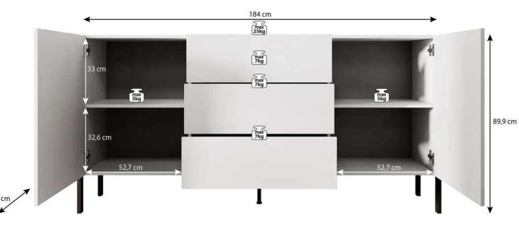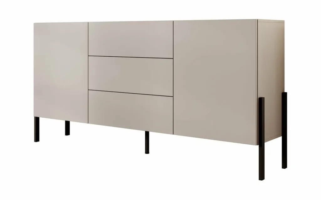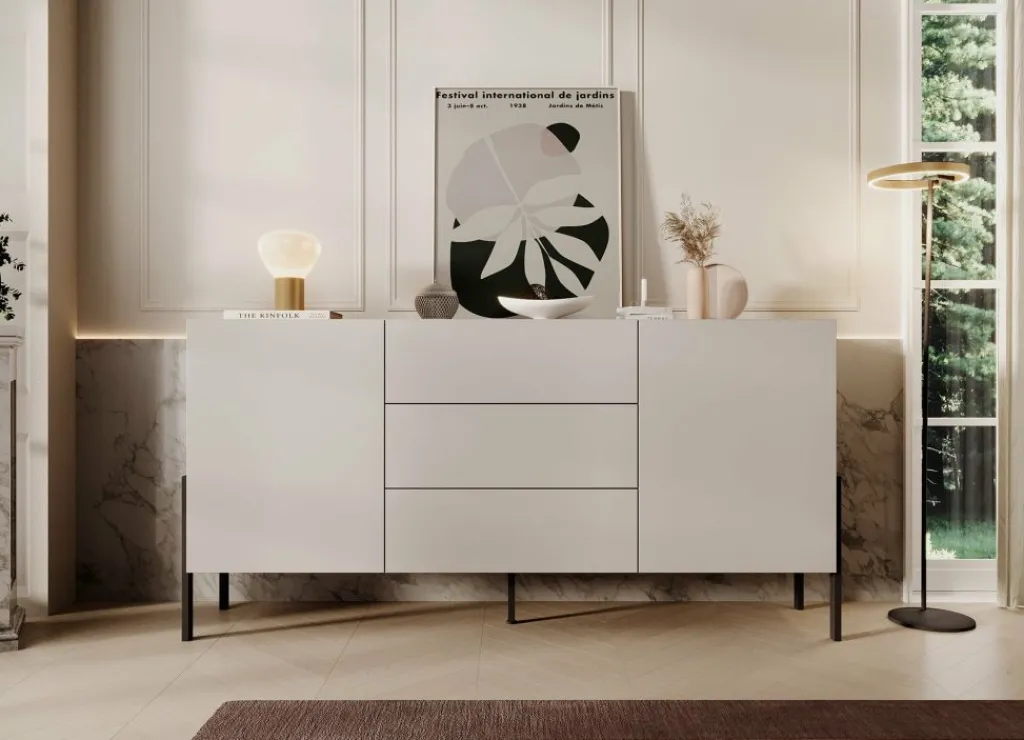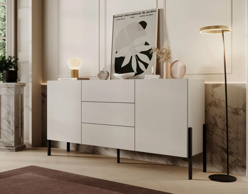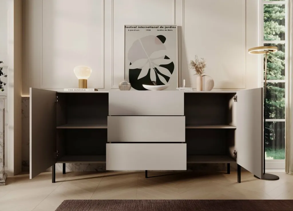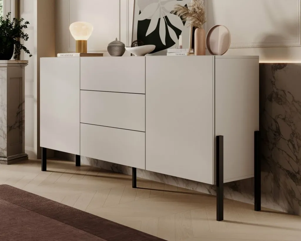 Dressoir Jordy is een opbergkast in een moderne stijl. Het dressoir staat op zwart metalen poten.