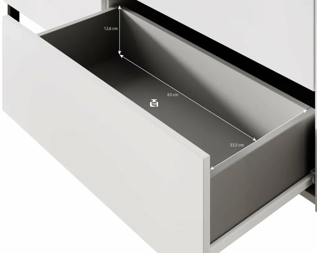De kast heeft 2 deuren en 3 lades welke te openen zijn met het push to open systeem. Achter deze deuren bevinden zich 4 opbergvakken.