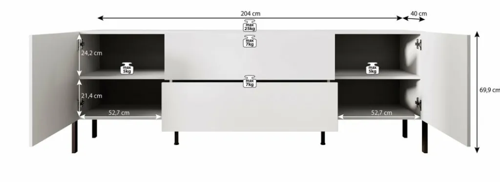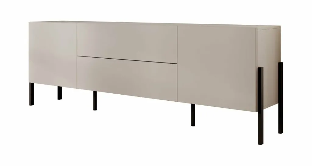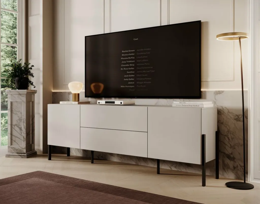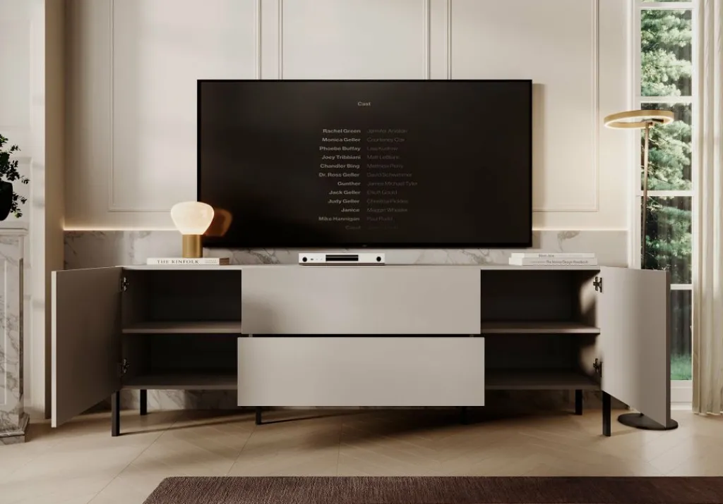 De Jordy beschikt over 2 deuren en 2 lades die openen met het push to open systeem. Achter de deurtjes zijn nog 4 opbergvakken te vinden. De tv kast staat op zwart metalen poten.