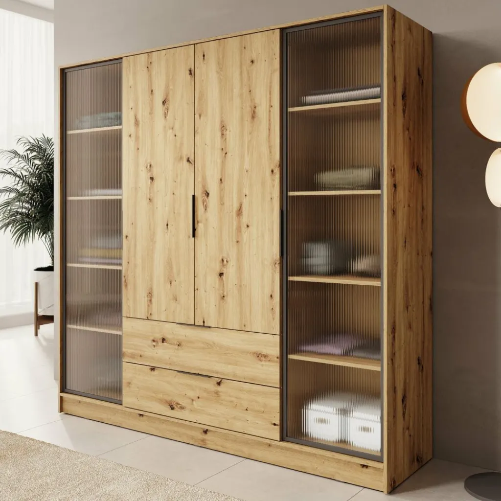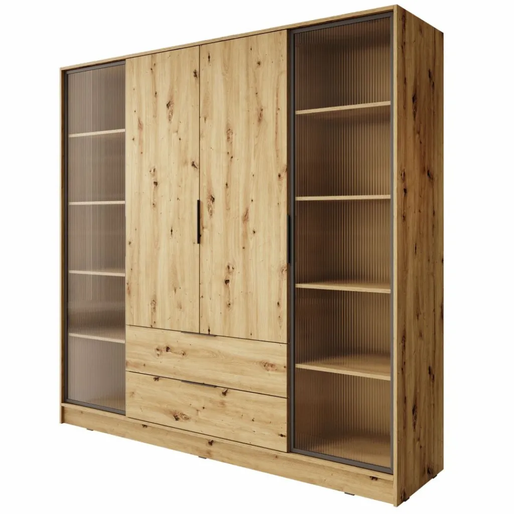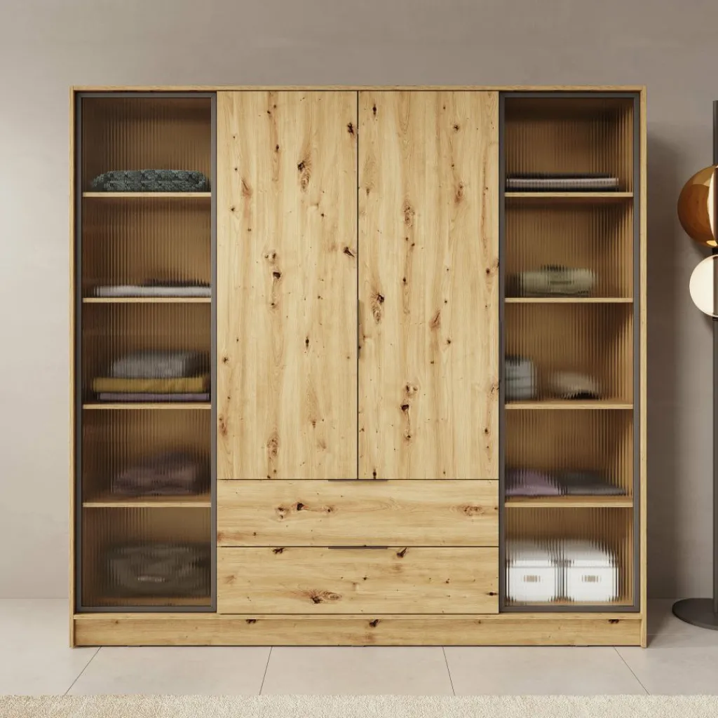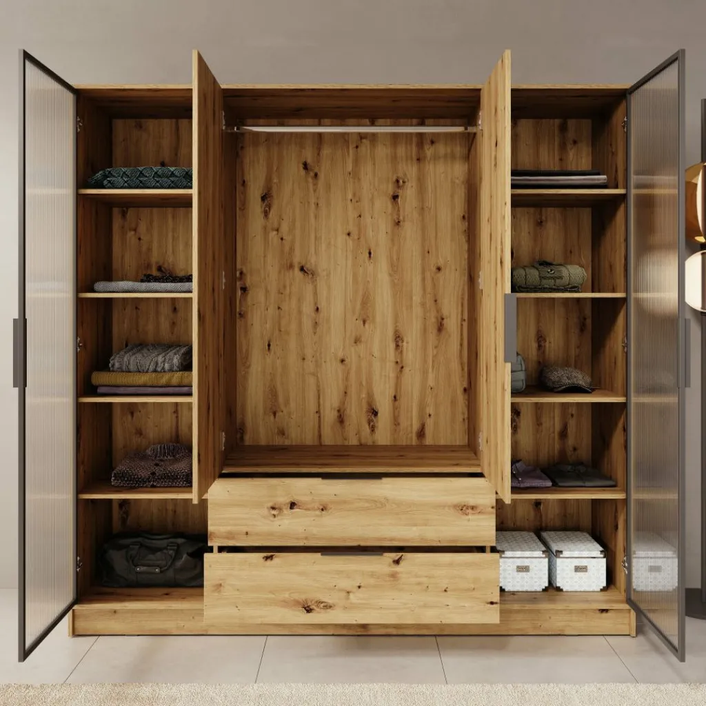 De kast heeft 4 scharnierdeuren, waarvan de buitenste zijn uitgevoerd met elegant gegroefd glas – een stijlvolle touch die zorgt voor een luchtige uitstraling. Achter de deuren vind je een slimme indeling: een royale kledingroede van 97 cm breed voor al je hangkleding, en maar liefst 10 opbergvakken met verschillende hoogtes. Perfect voor gevouwen kleding, dozen of tassen.