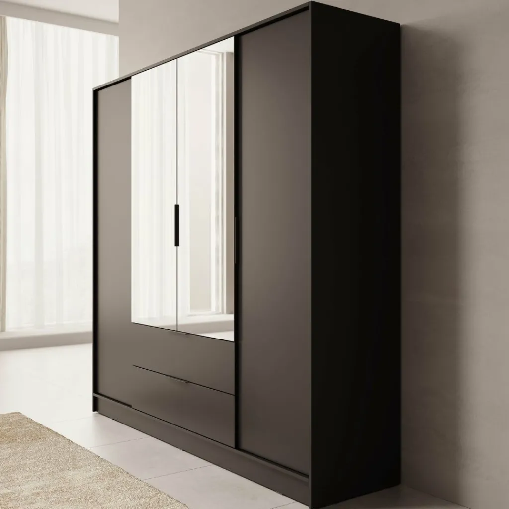 Deze moderne garderobekast is uitgevoerd in een zwarte kleur en past moeiteloos in uiteenlopende interieurstijlen. De twee middelste deuren zijn voorzien van grote spiegels die niet alleen functioneel zijn, maar ook zorgen voor een ruimtelijk effect in de kamer.