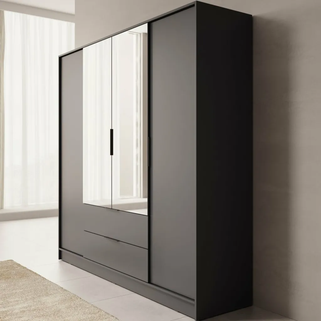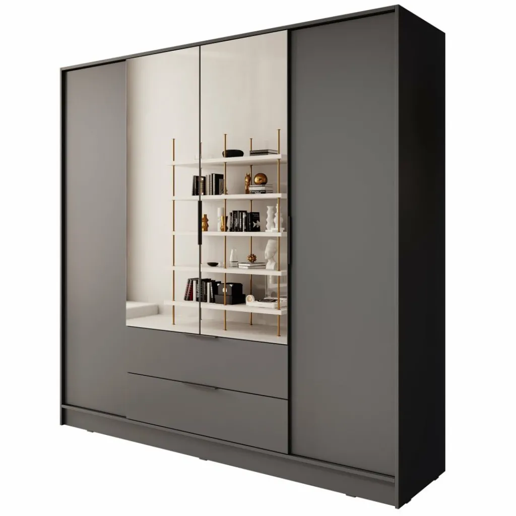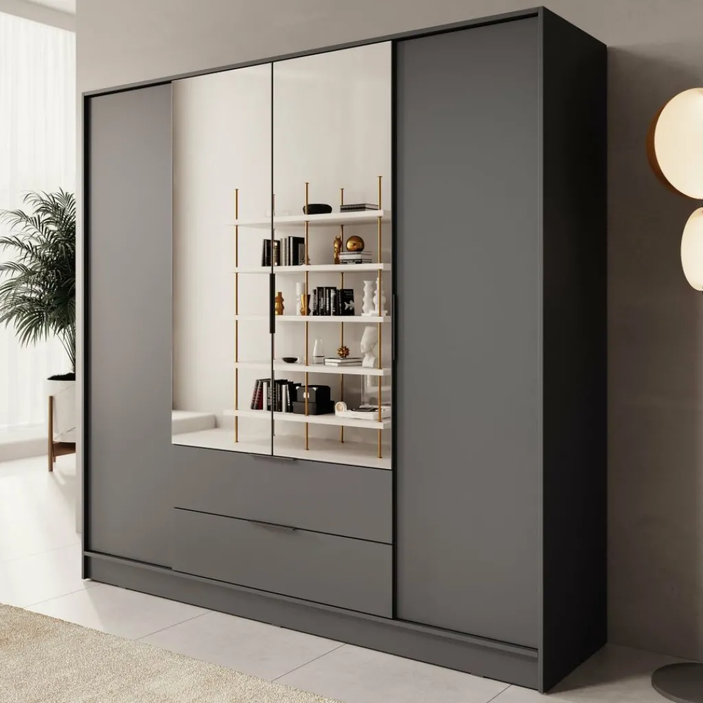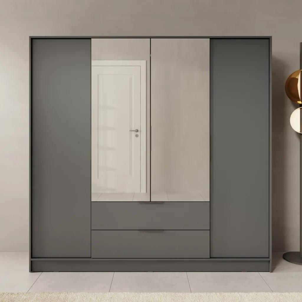 Deze moderne garderobekast is uitgevoerd in een neutrale grijze kleur en past moeiteloos in uiteenlopende interieurstijlen. De twee middelste deuren zijn voorzien van grote spiegels die niet alleen functioneel zijn, maar ook zorgen voor een ruimtelijk effect in de kamer.