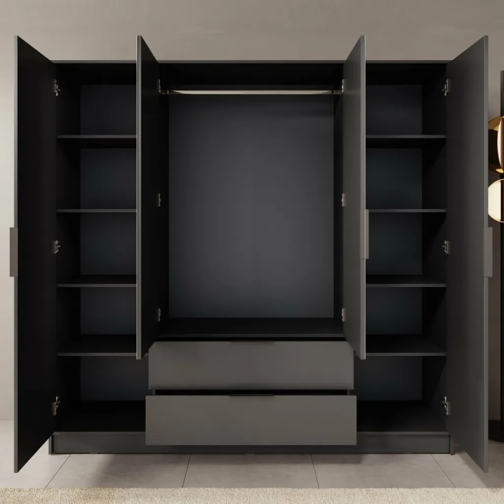 Achter de vier scharnierdeuren bevindt zich een doordachte indeling met voldoende opbergmogelijkheden. In het midden is een kledingroede van 97 cm breed geplaatst, waar je moeiteloos al je hangkleding aan kwijt kunt. Daarnaast zijn er tien legvakken in verschillende formaten, perfect voor gevouwen kleding, accessoires of schoenen. Onderin de kast zitten twee royale lades van 92 bij 40 cm, met een diepte van 15 cm. Ideaal voor het opbergen van ondergoed, sokken of beddengoed.