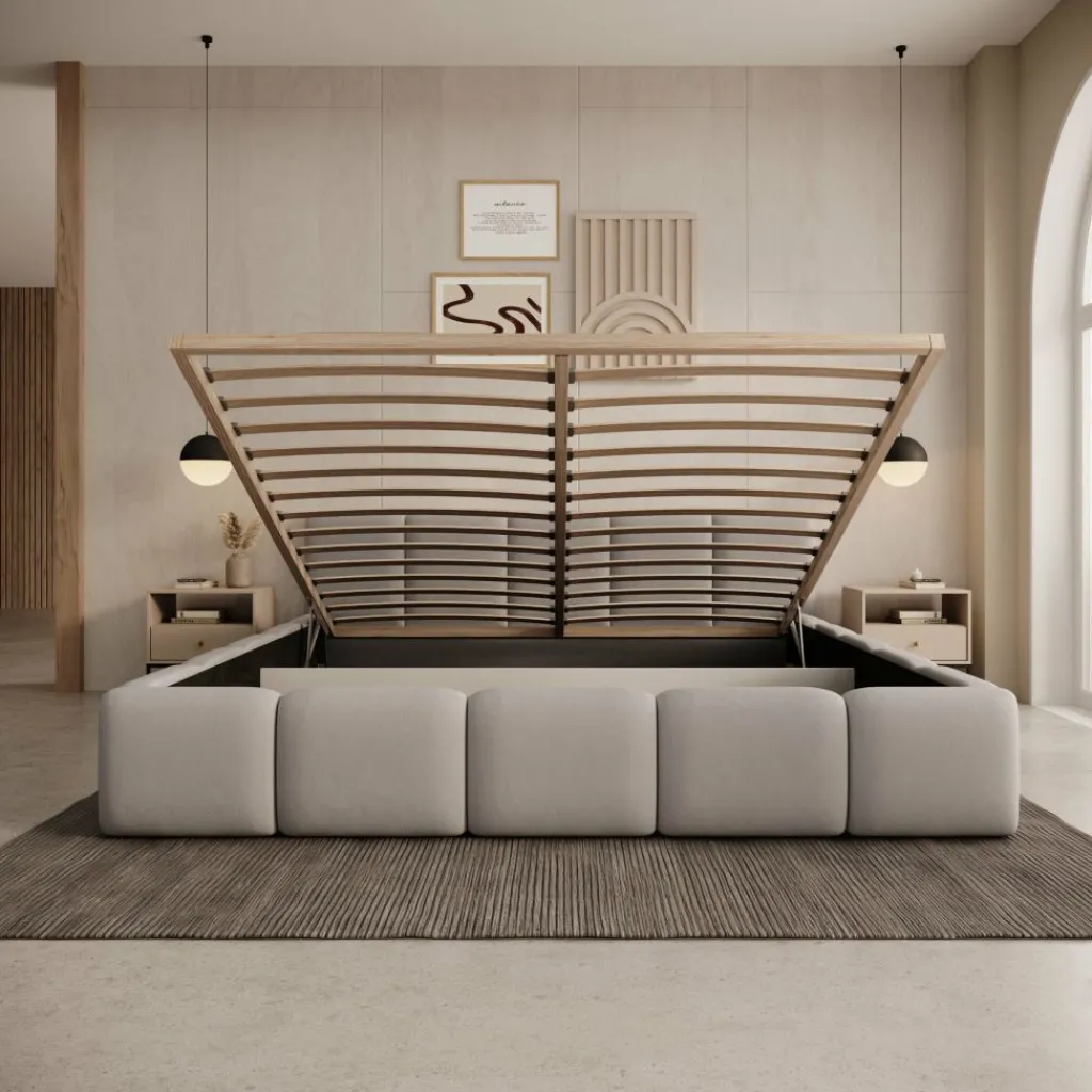Onder het liggedeelte bevindt zich een ruime opbergbak, bereikbaar via het omhoog te openen bedframe. Deze opbergruimte is praktisch voor het opbergen van beddengoed of andere spullen. Dankzij de meebewegende lattenbodem blijft de opbergbak goed toegankelijk.