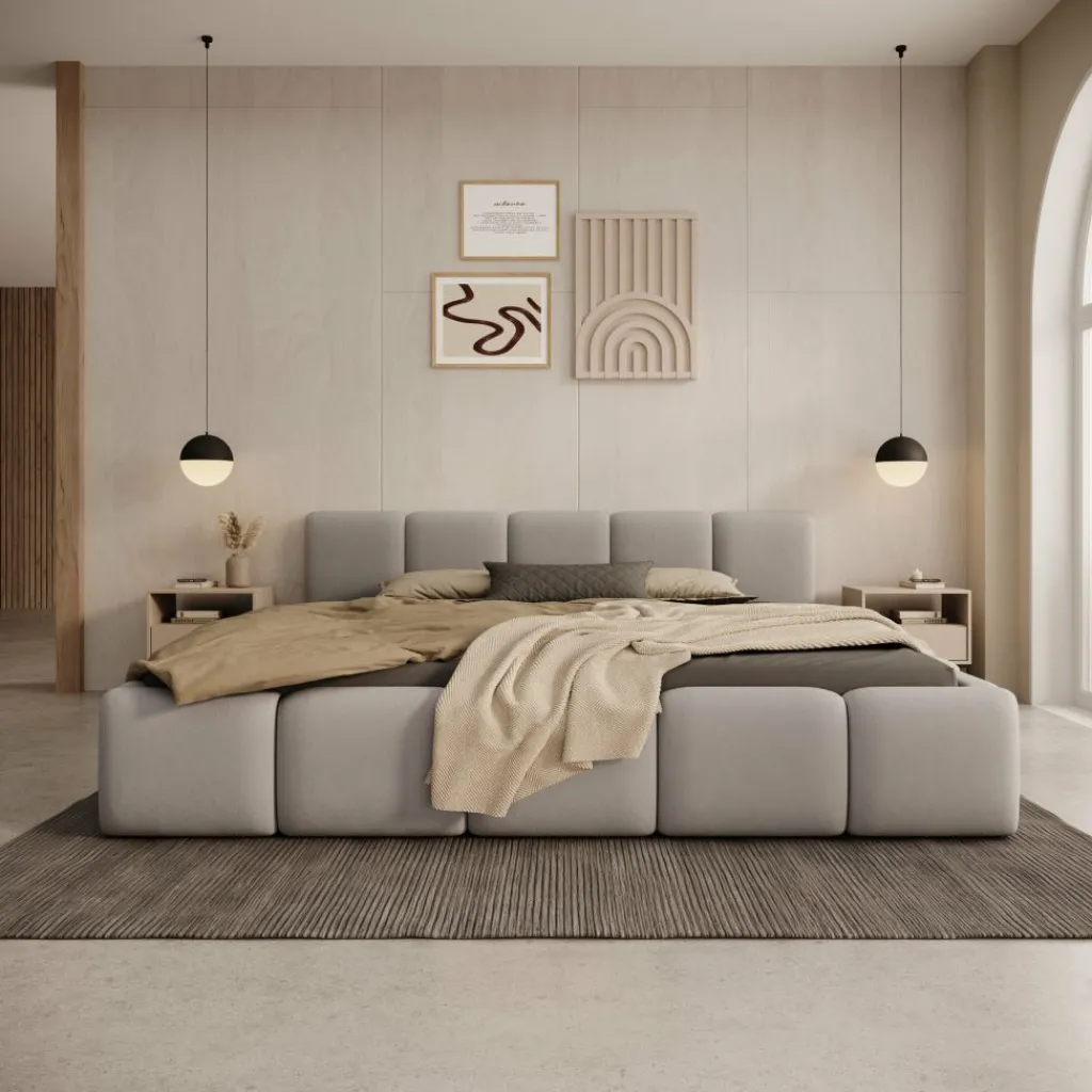 De Karisma staat stabiel op de vloer en is volledig gestoffeerd aan alle zichtbare zijden. Hierdoor vormt het bed een gesloten geheel en kan het ook vrij in de slaapkamer worden geplaatst. Matrassen worden niet meegeleverd.