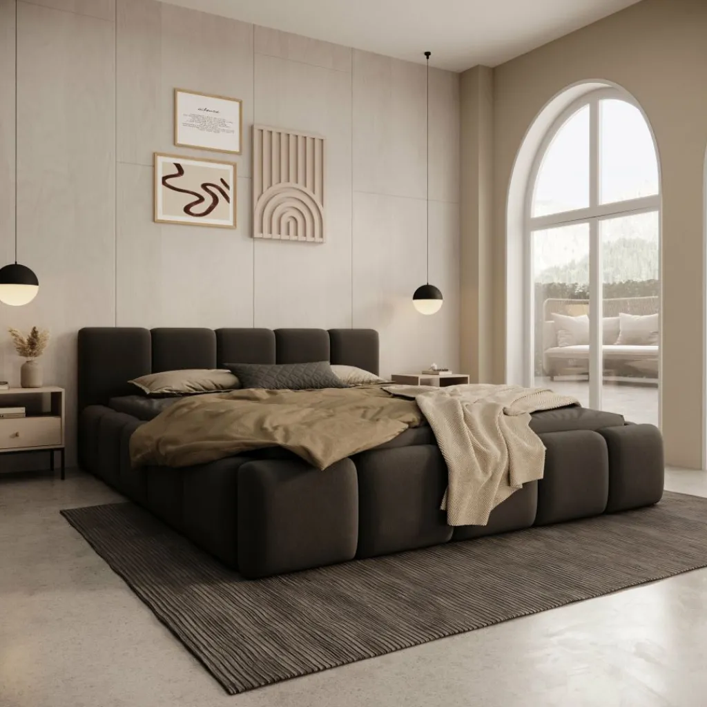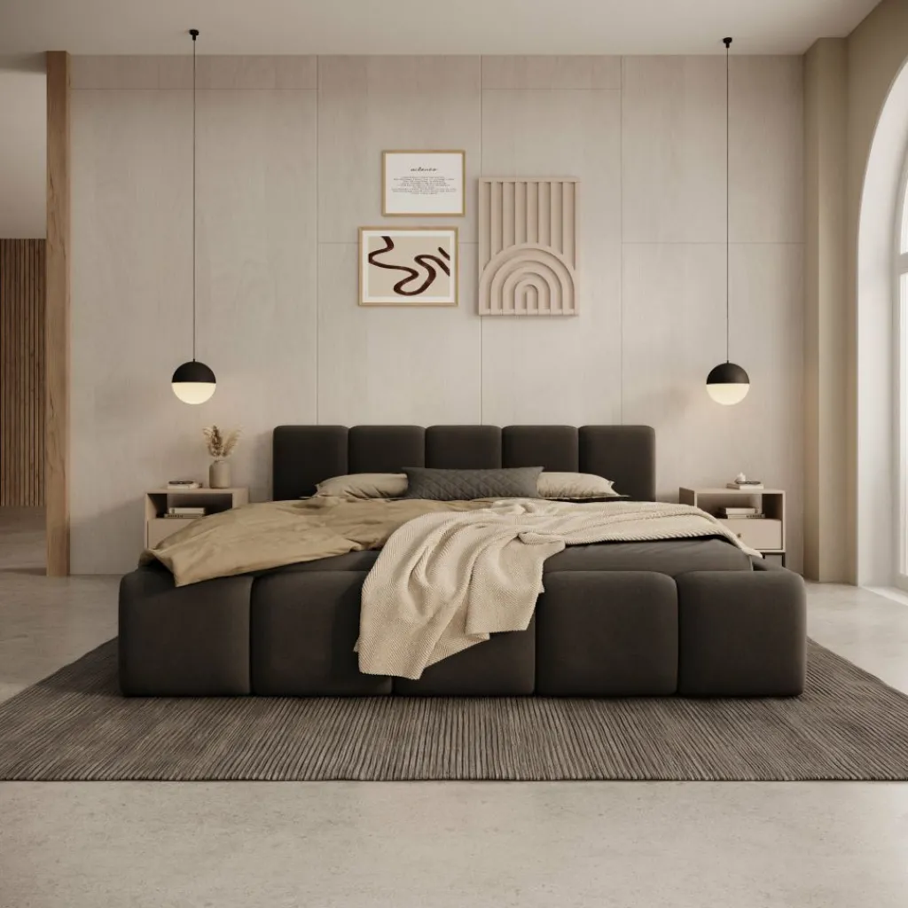 Tweepersoonsbed Karisma is een gestoffeerd bed met opbergruimte, uitgevoerd in zwart velvet en geschikt voor een matras van 140×200 cm. Het bed heeft een lage, brede vormgeving met een strak opgebouwd hoofdbord en een volledig rondom beklede bedombouw. De zwarte velvet stof zorgt voor een egale, diepe kleur en een verzorgde afwerking.