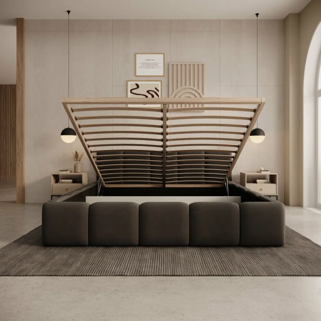 Onder het liggedeelte bevindt zich een ruime opbergbak die bereikbaar is via het omhoog te openen bedframe. Deze opbergruimte is geschikt voor het opbergen van beddengoed, kussens of andere spullen. Het bed is voorzien van een lattenbodem die meebeweegt bij het openen, waardoor de opbergbak goed toegankelijk blijft.