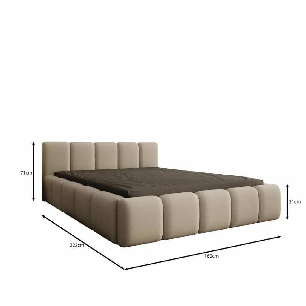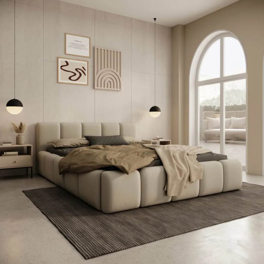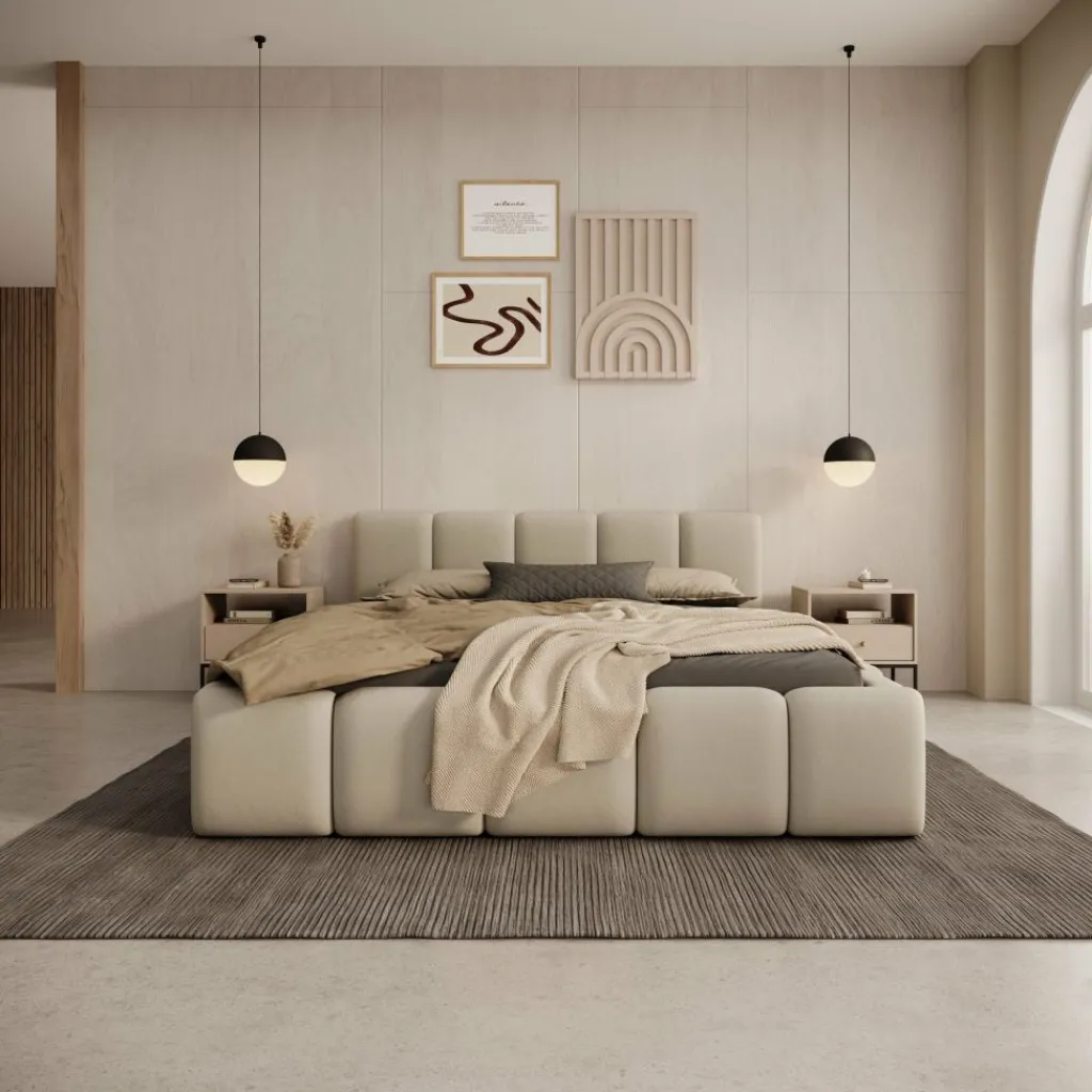 Tweepersoonsbed Karisma is een gestoffeerd bed met opbergruimte, uitgevoerd in beige stof en geschikt voor een matras van 140×200 cm. Het bed heeft een lage, brede vormgeving met een strak opgebouwd hoofdbord en een volledig rondom beklede bedombouw. Door de neutrale kleur en rustige afwerking past dit model goed in moderne slaapkamers.
