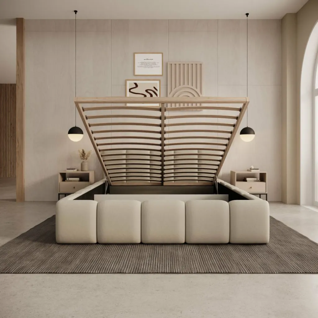 Onder het liggedeelte bevindt zich een ruime opbergbak, bereikbaar via het omhoog te openen bedframe. Dit maakt het bed praktisch voor het opbergen van beddengoed, kussens of andere spullen die je uit het zicht wilt houden. Het frame is voorzien van een lattenbodem die meebeweegt bij het openen, waardoor de opbergruimte eenvoudig toegankelijk blijft.